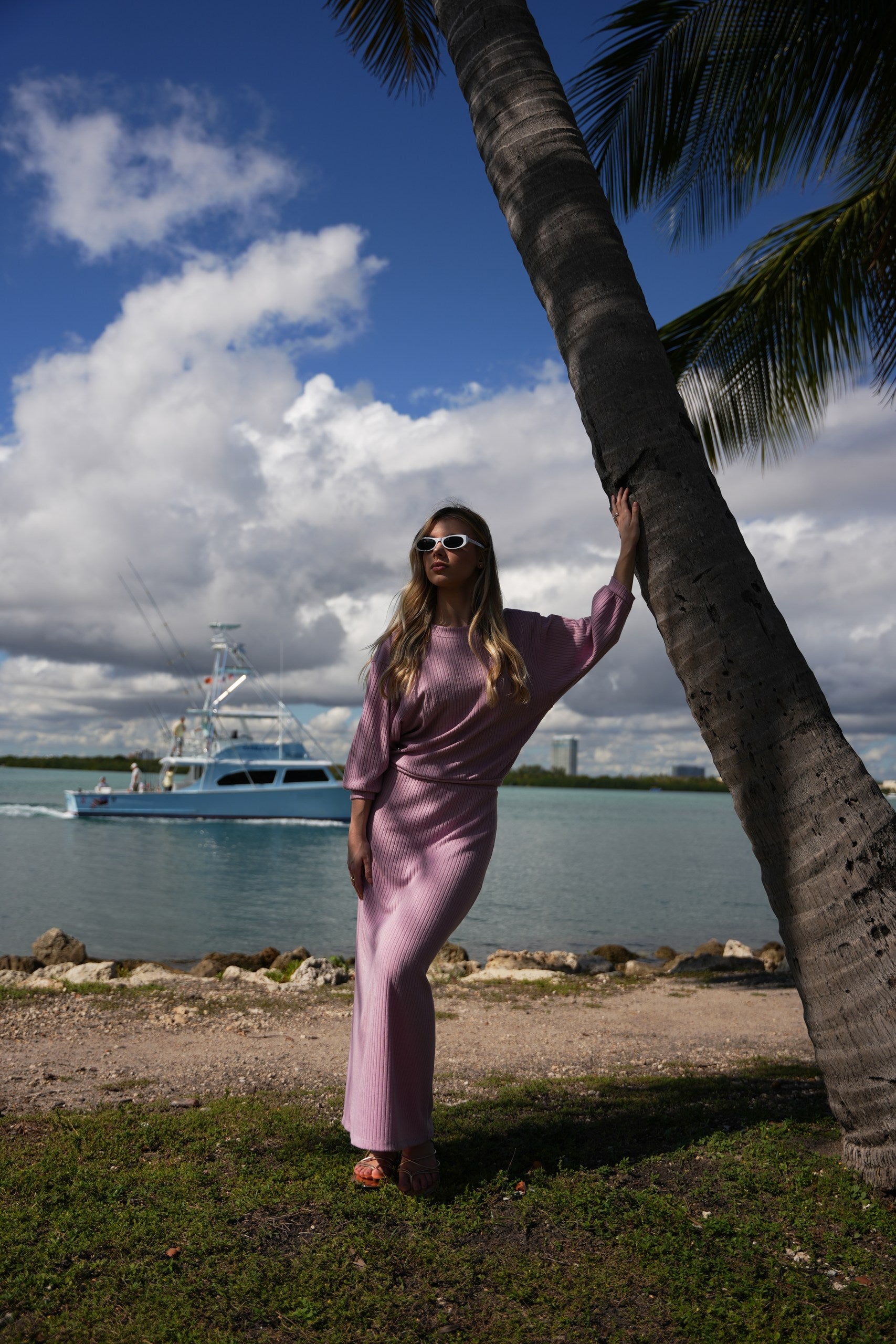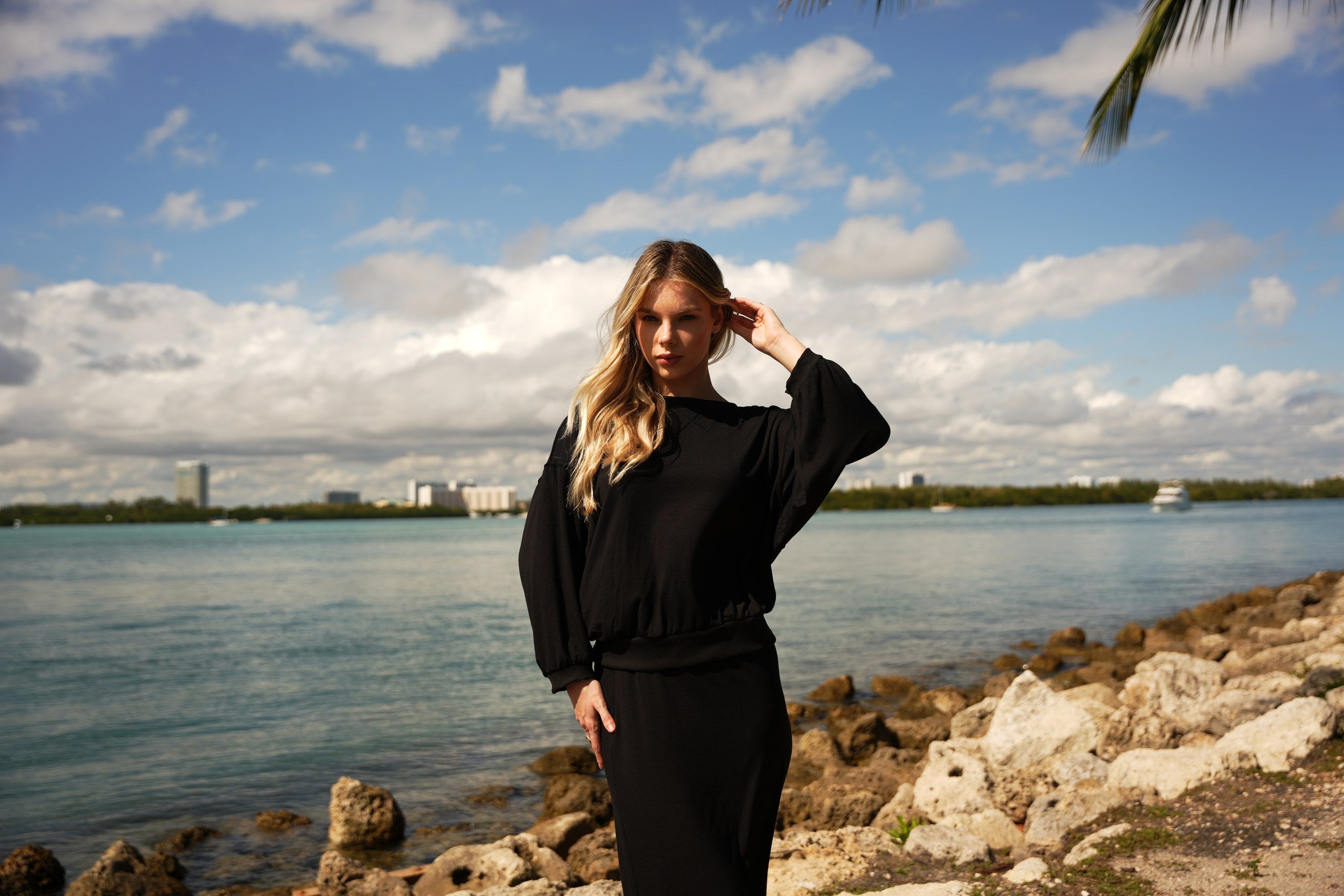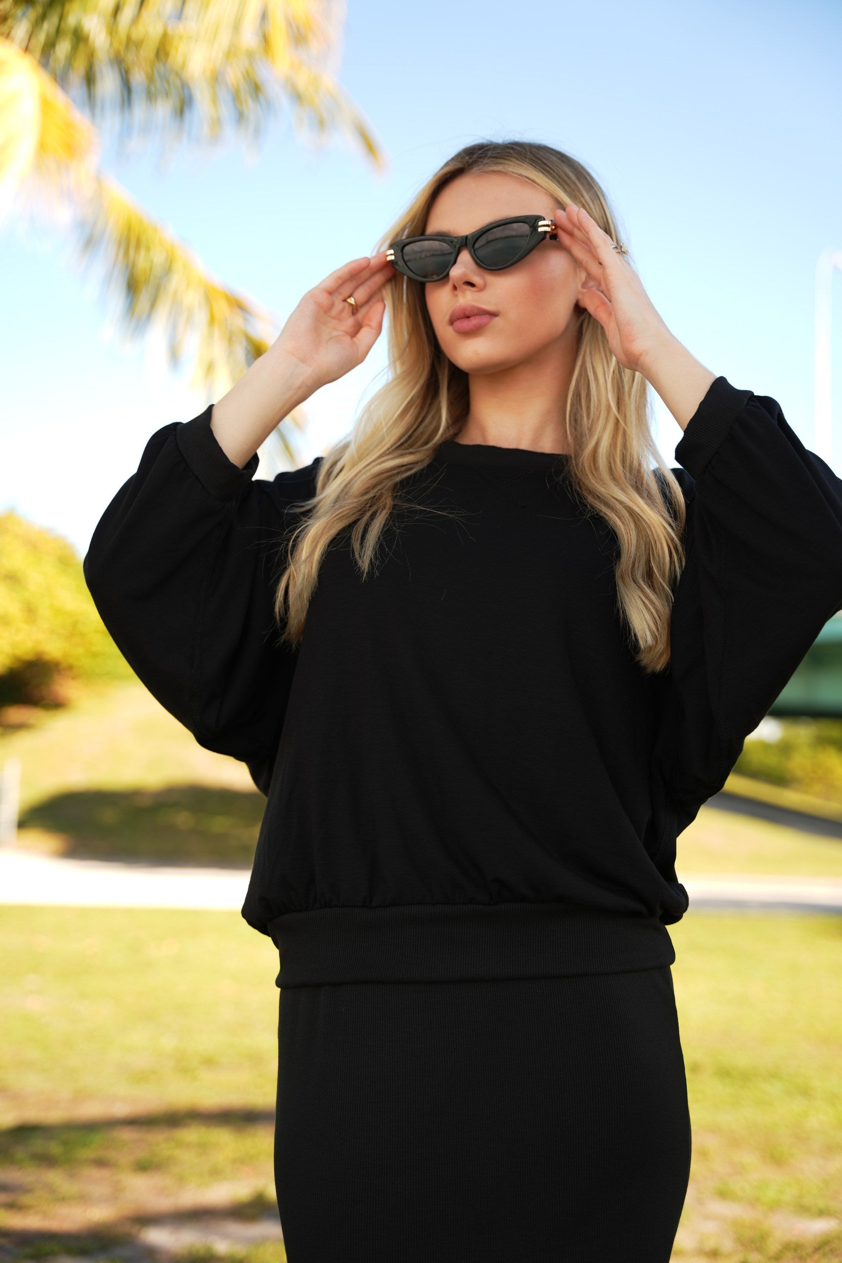 Designed with a slightly oversized fit and subtle ribbed texture, it drapes effortlessly on the body. The sleeves fall past the elbow for comfortable, modest coverage, while the length hits just below the waist for an easy, flattering silhouette. It pairs perfectly with our Pencil Maxi Skirt for a polished look that still feels relaxed.