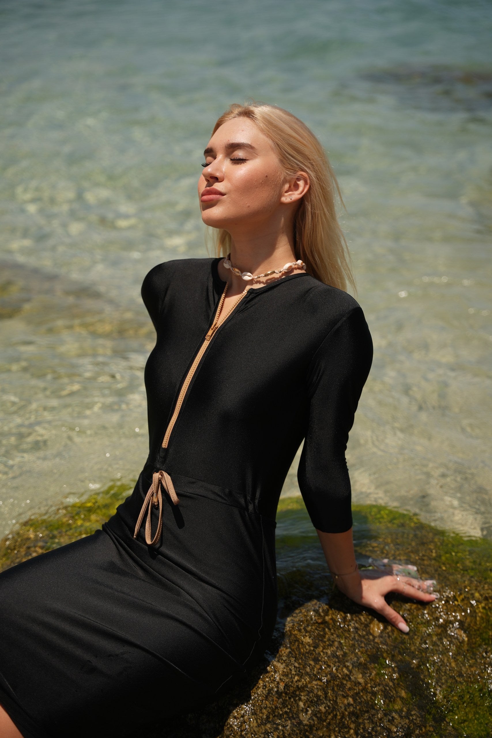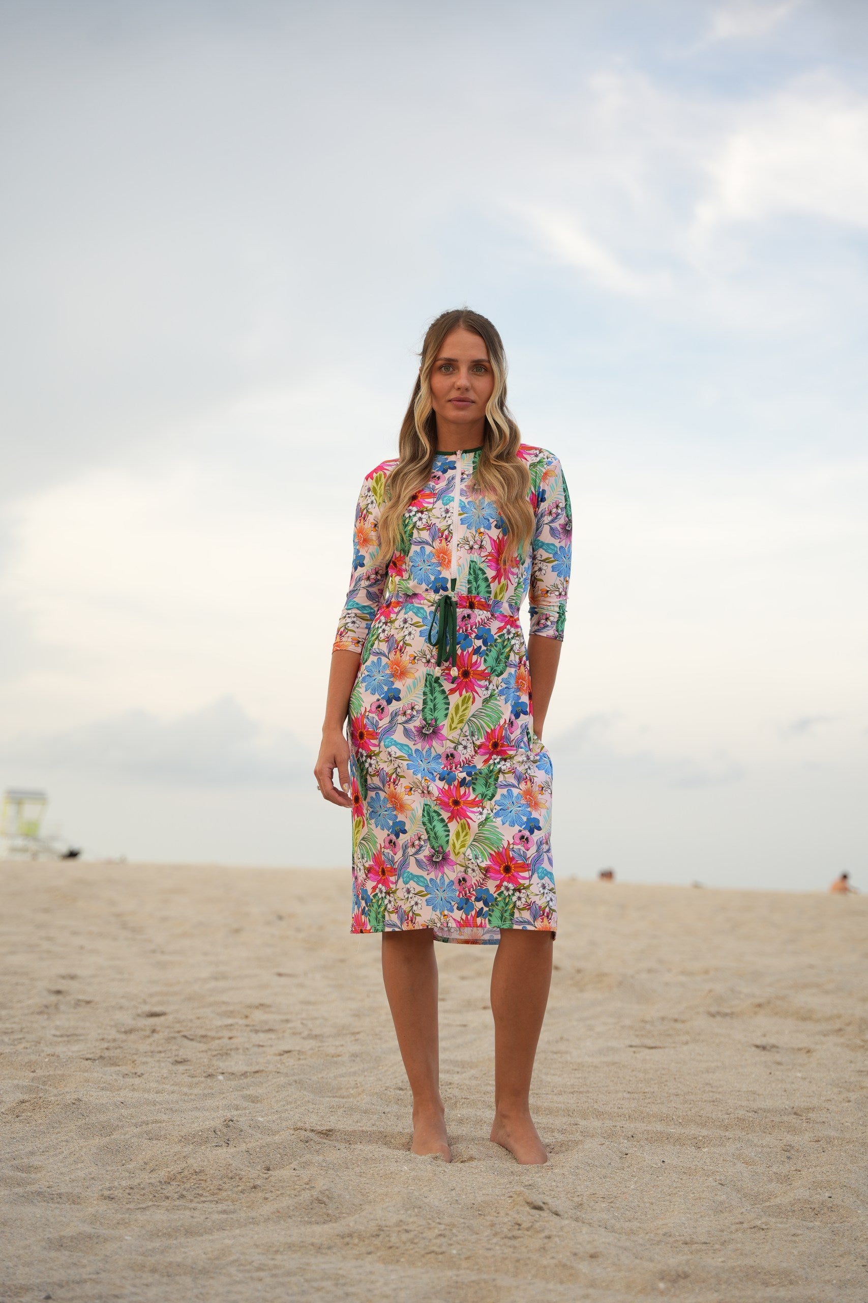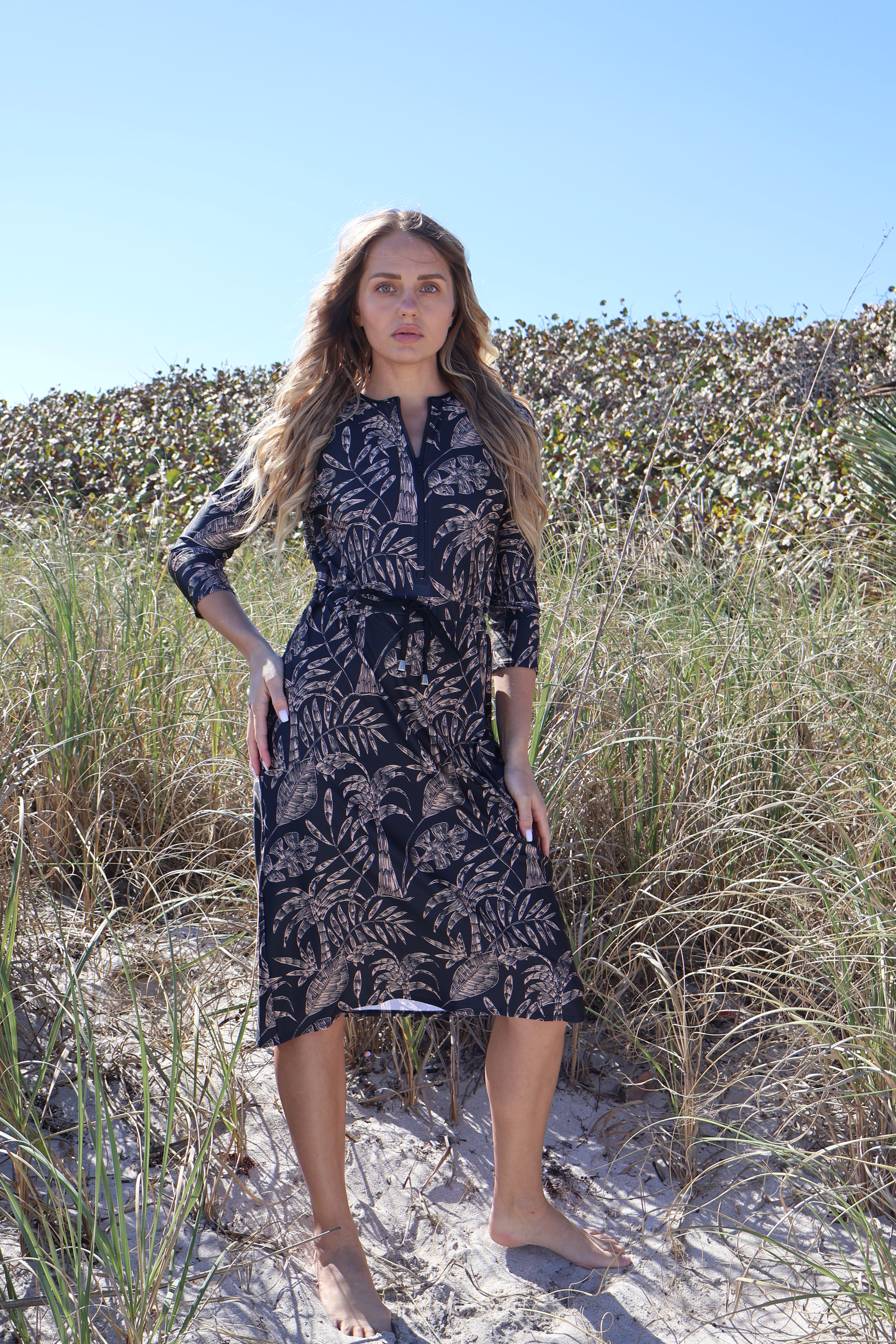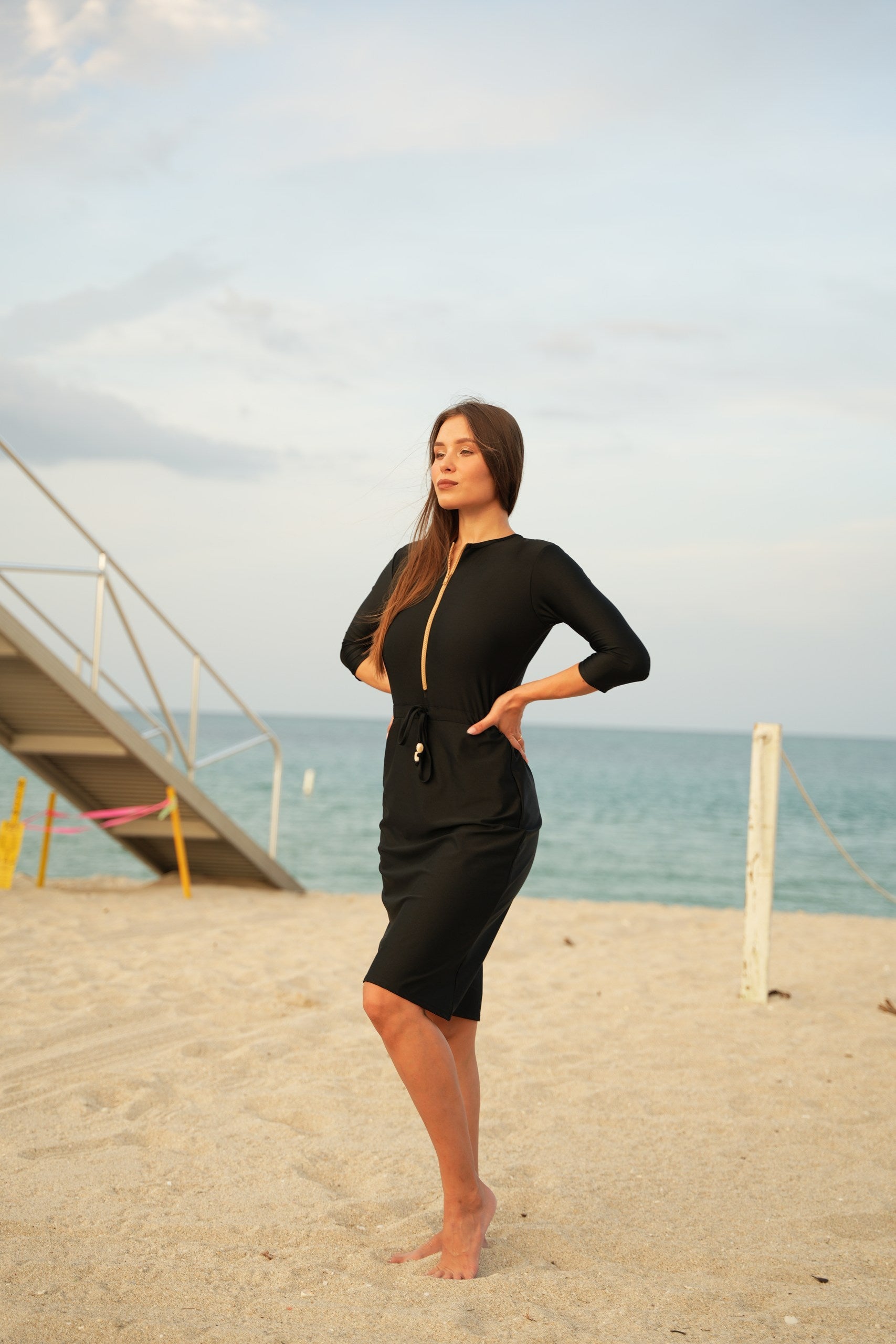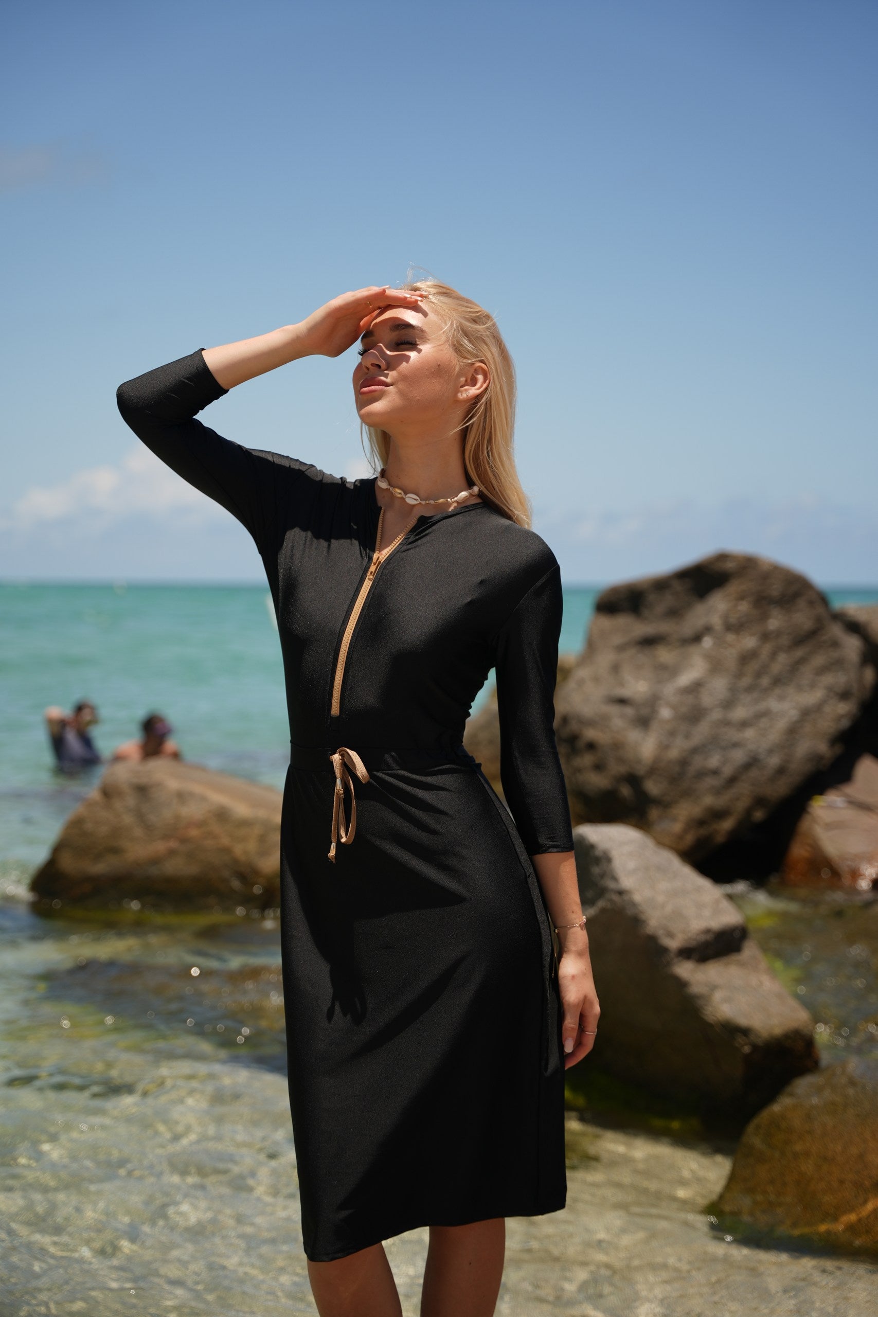 The Becca dress— dubbed the "little black dress" of modest swimwear. It's now available in Becca 3.0, with 3 extra inches of coverage, because we know you want more. This versatile jumper’s got your back whether you're swimming, hitting the courts, or just running errands. The jewel neckline and 12” zipper make it easy to slip in and out of, while the attached shorts keep things comfy and practical. The sleeve hits just right between the elbow and wrist, and the slight hi/lo hemline? Super flattering. Cinch the waist for a tighter fit or leave it relaxed—totally up to you. Made from quick-dry spandex, Becca 3.0 keeps you cool, comfy, and covered no matter where the day takes you.