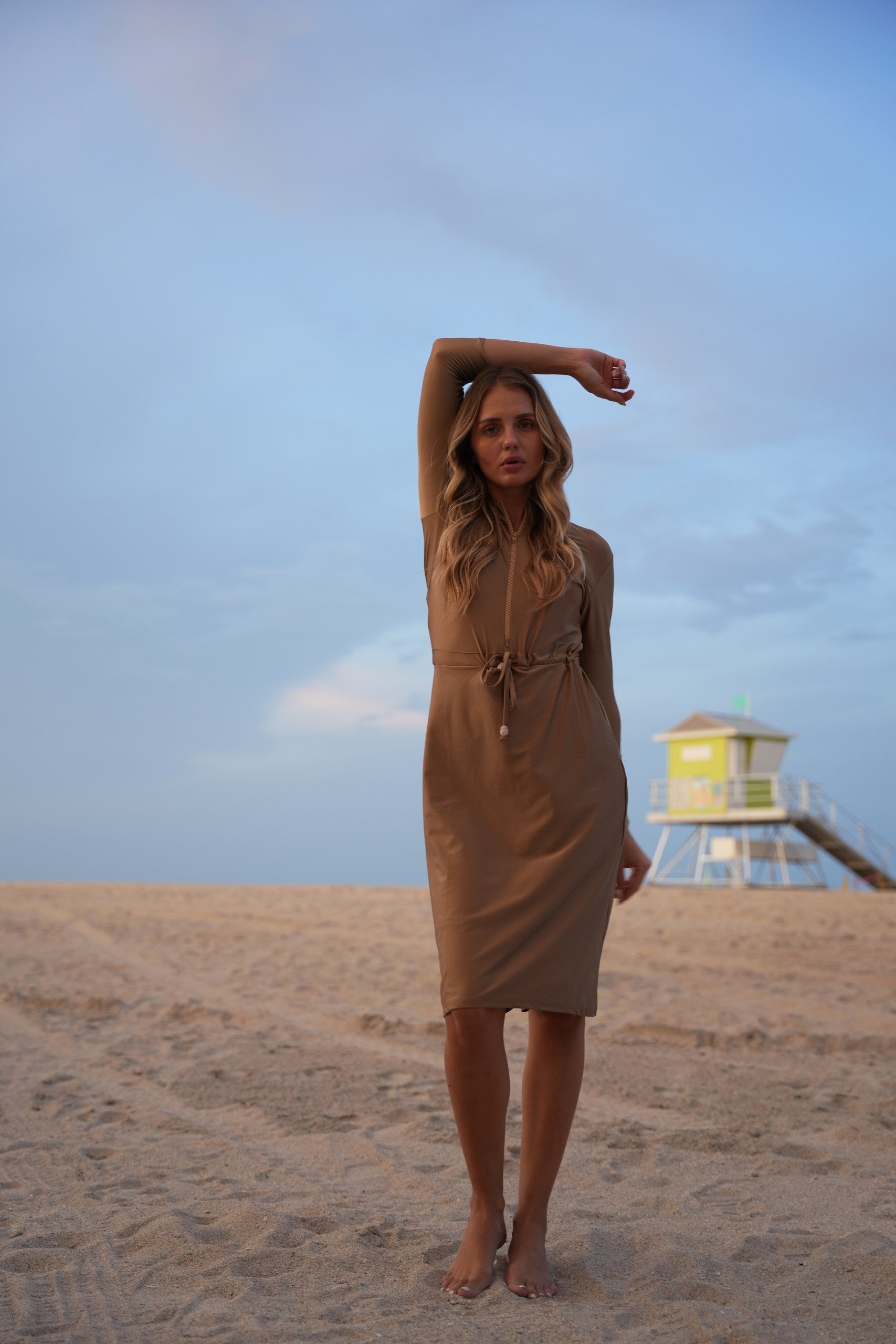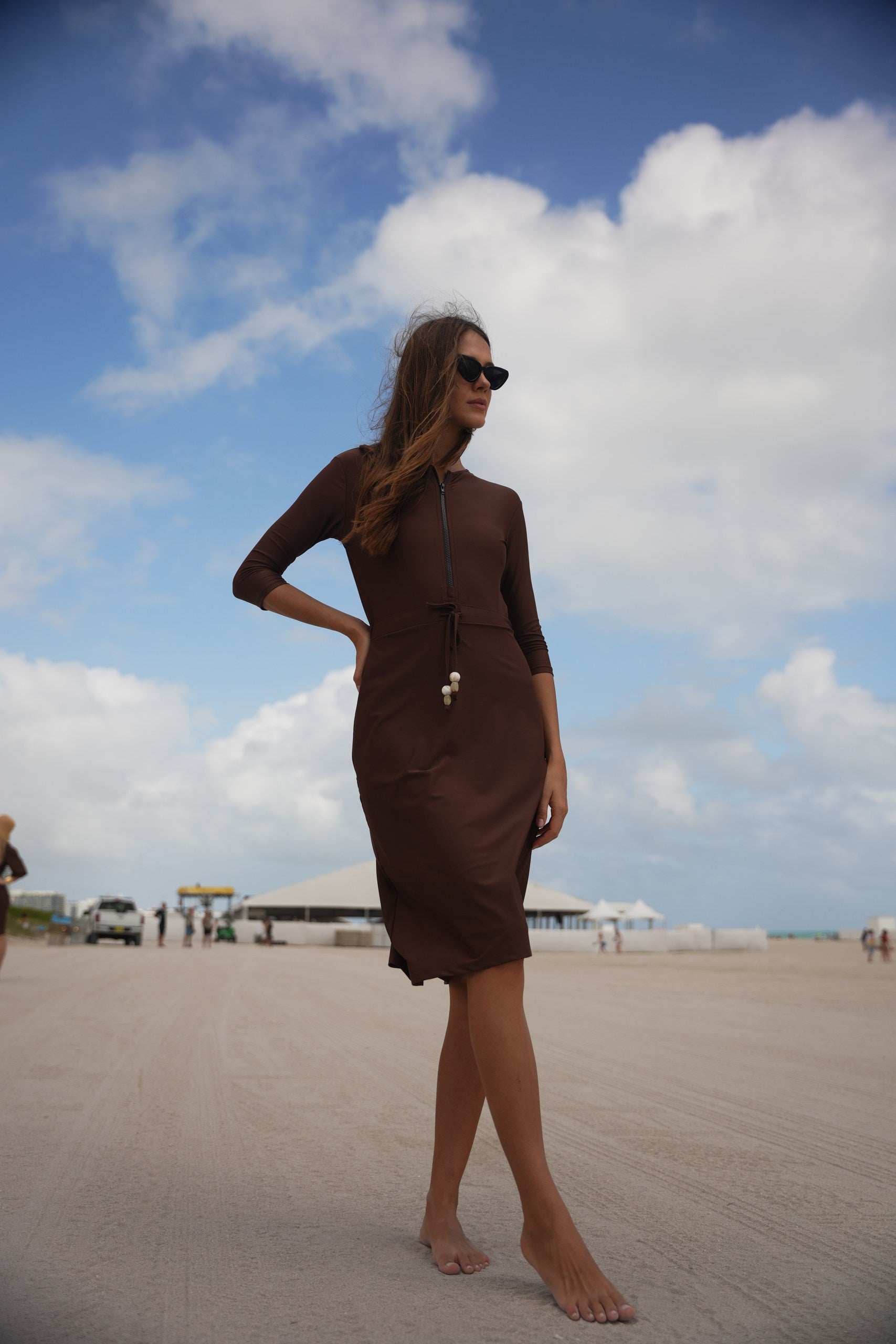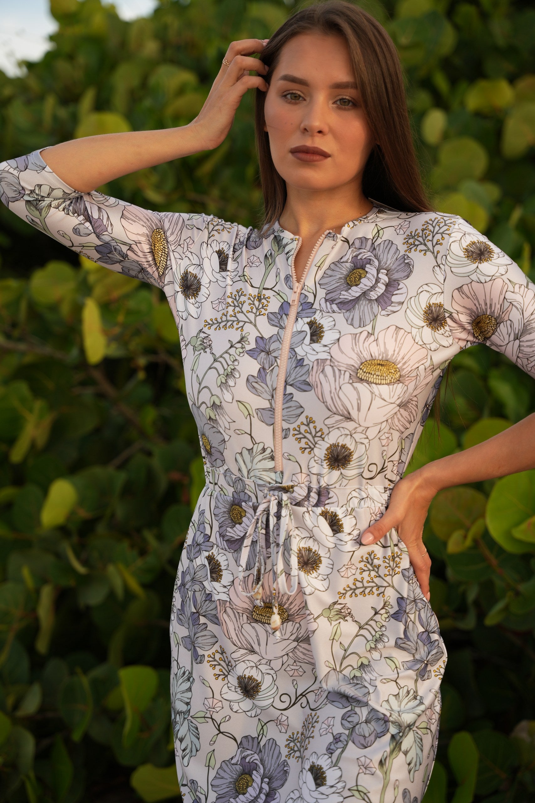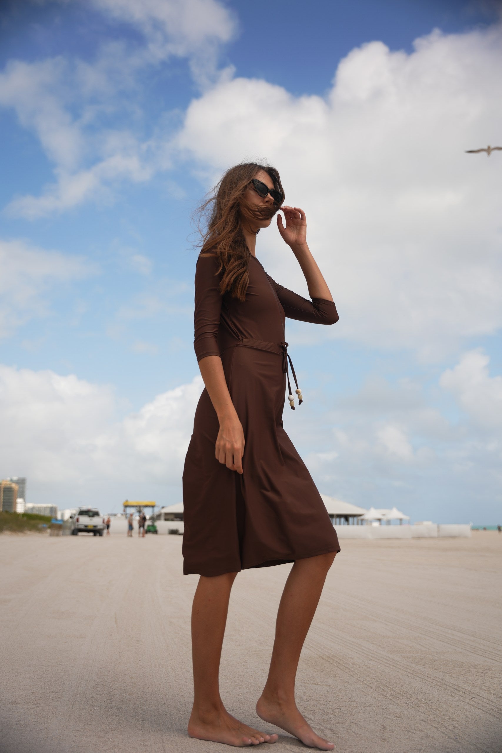 The Becca dress— dubbed the "little black dress" of modest swimwear. It's now available in Becca 3.0, with 3 extra inches of coverage, because we know you want more. This versatile jumper’s got your back whether you're swimming, hitting the courts, or just running errands. The jewel neckline and 12” zipper make it easy to slip in and out of, while the attached shorts keep things comfy and practical. The sleeve hits just right between the elbow and wrist, and the slight hi/lo hemline? Super flattering. Cinch the waist for a tighter fit or leave it relaxed—totally up to you. Made from quick-dry spandex, Becca 3.0 keeps you cool, comfy, and covered no matter where the day takes you.