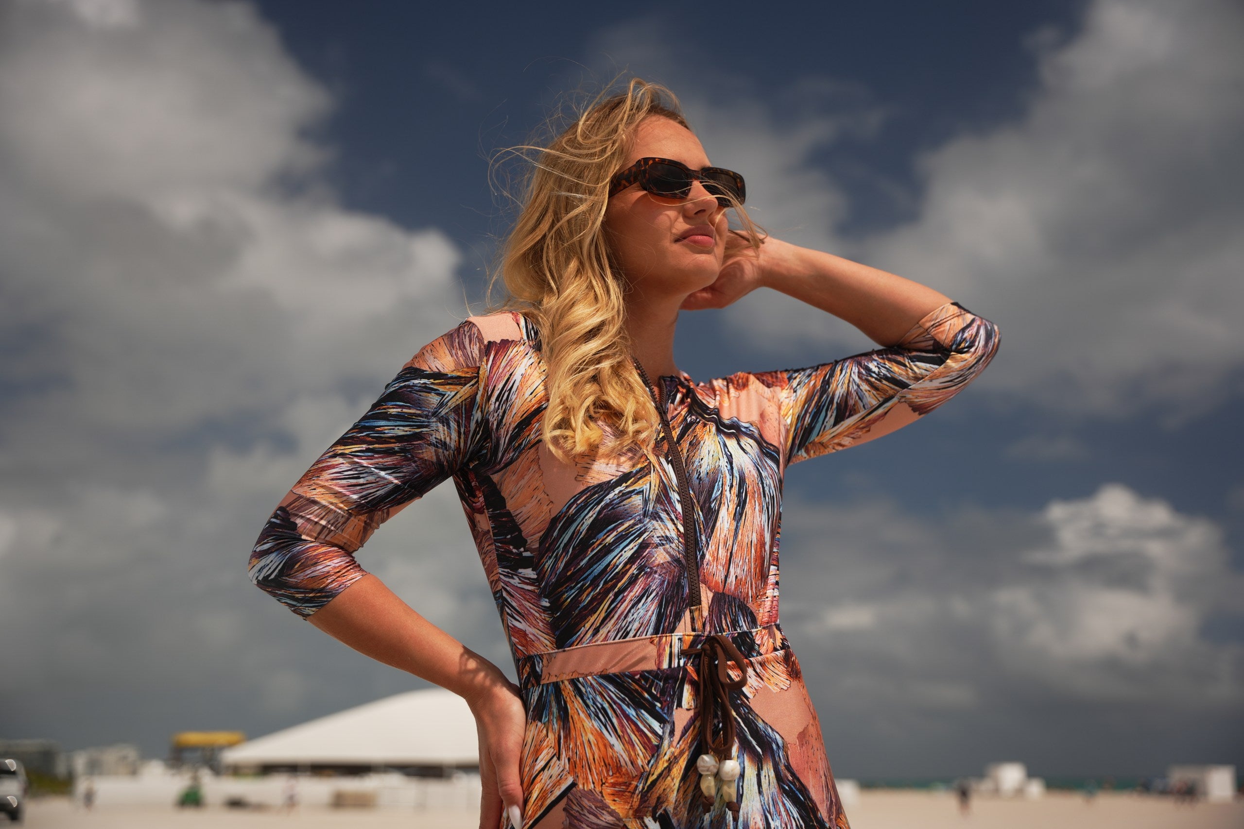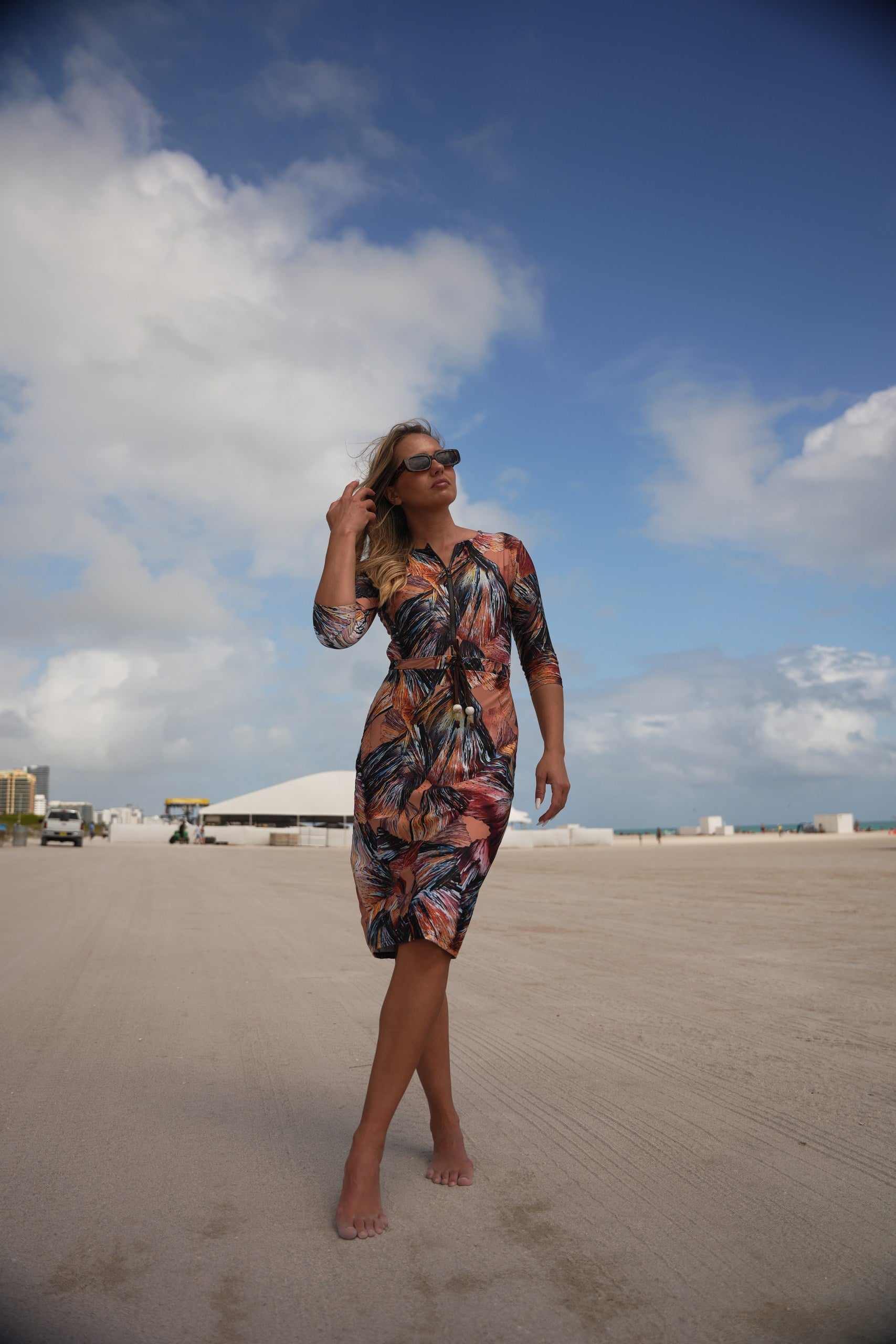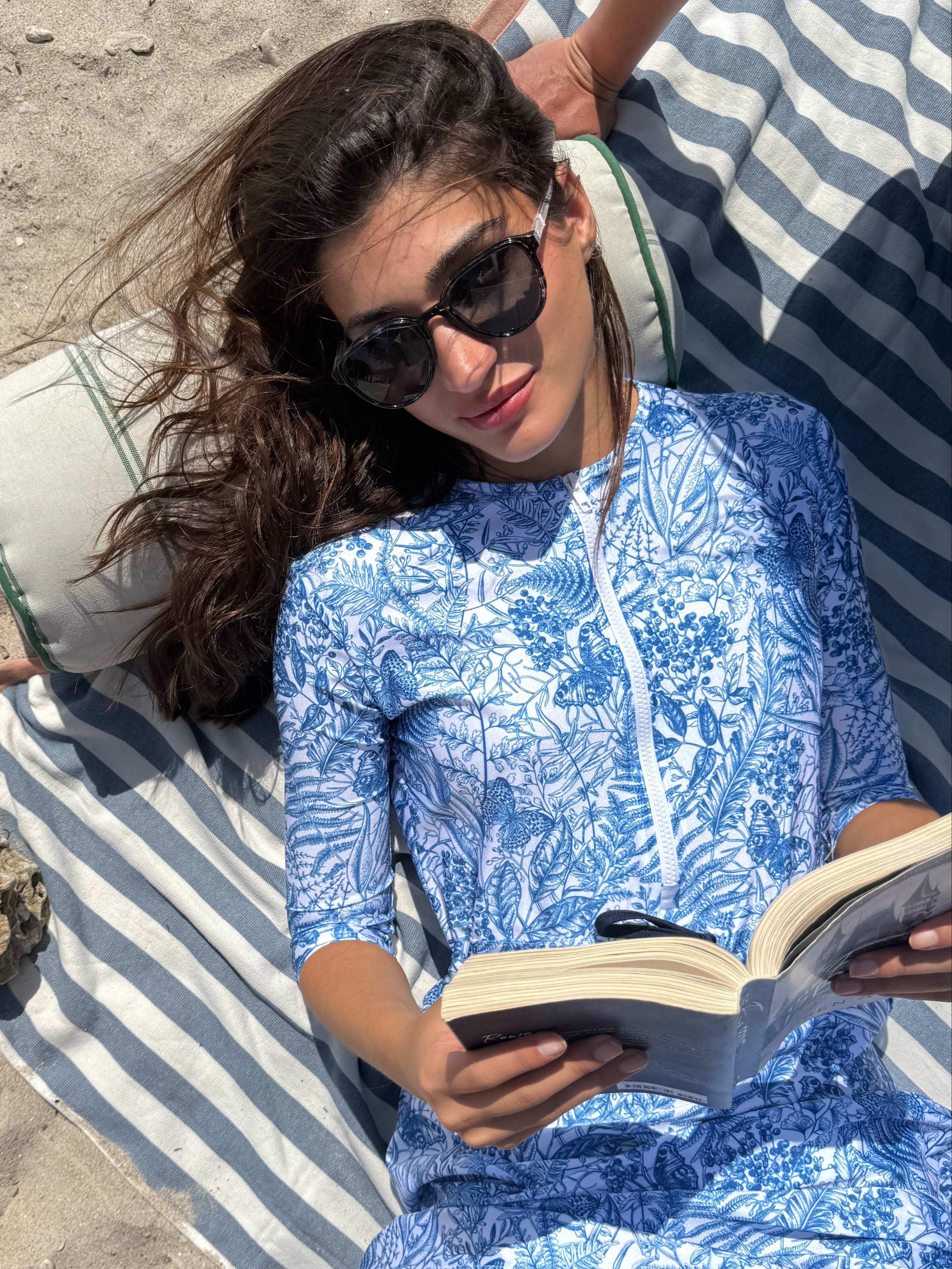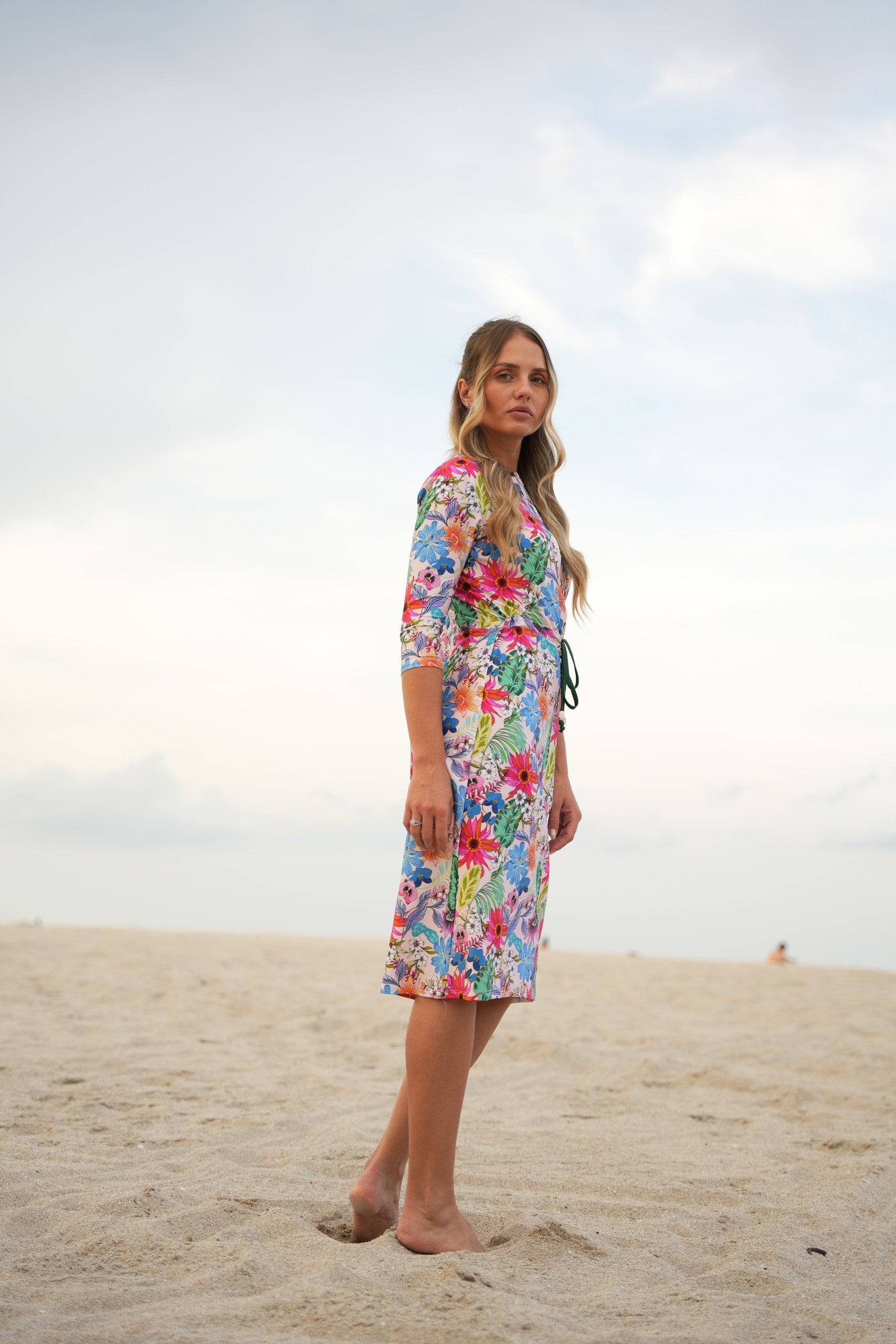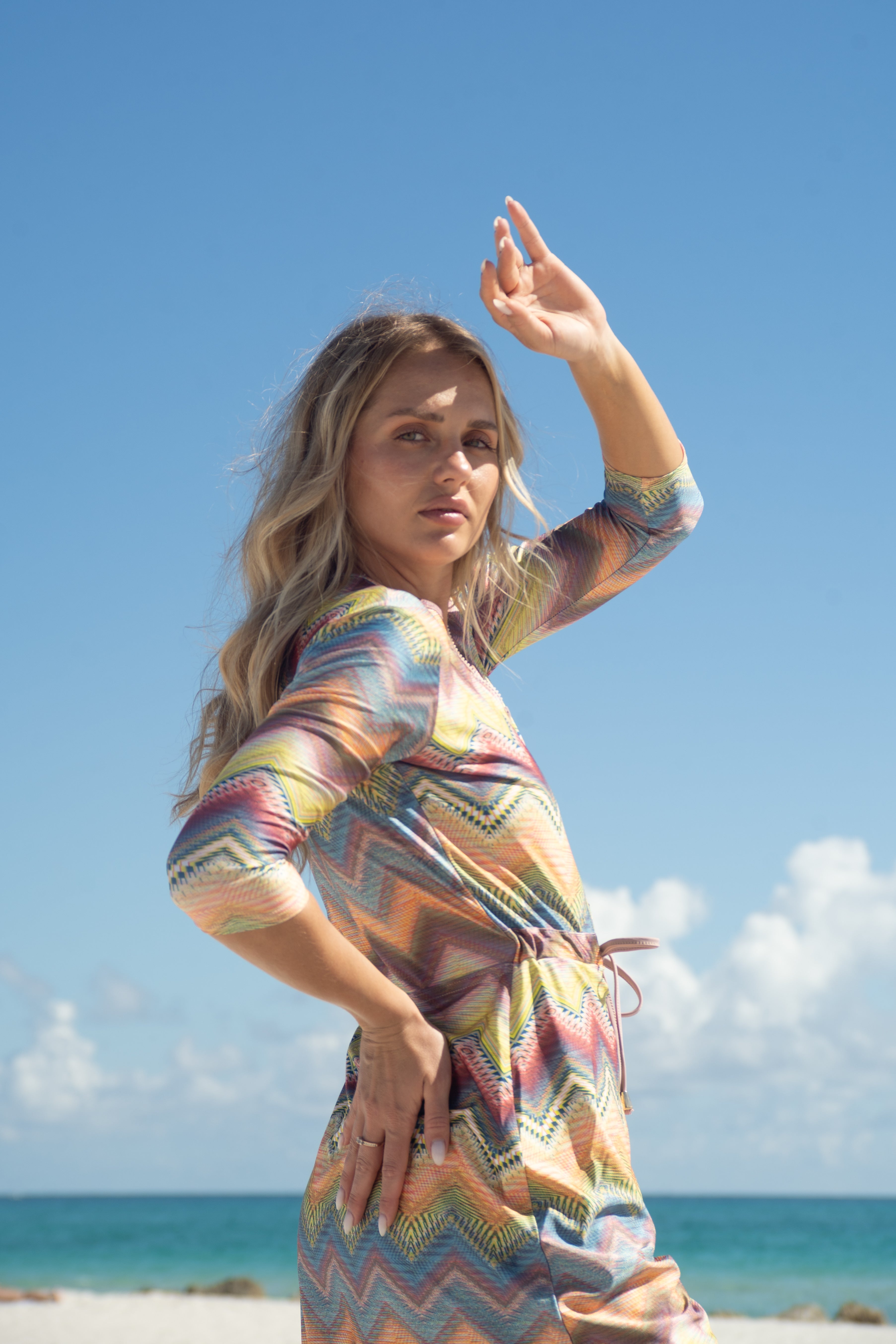 The Becca dress— dubbed the "little black dress" of modest swimwear. It's now available in Becca 3.0, with 3 extra inches of coverage, because we know you want more. This versatile jumper’s got your back whether you're swimming, hitting the courts, or just running errands. The jewel neckline and 12” zipper make it easy to slip in and out of, while the attached shorts keep things comfy and practical. The sleeve hits just right between the elbow and wrist, and the slight hi/lo hemline? Super flattering. Cinch the waist for a tighter fit or leave it relaxed—totally up to you. Made from quick-dry spandex, Becca 3.0 keeps you cool, comfy, and covered no matter where the day takes you.