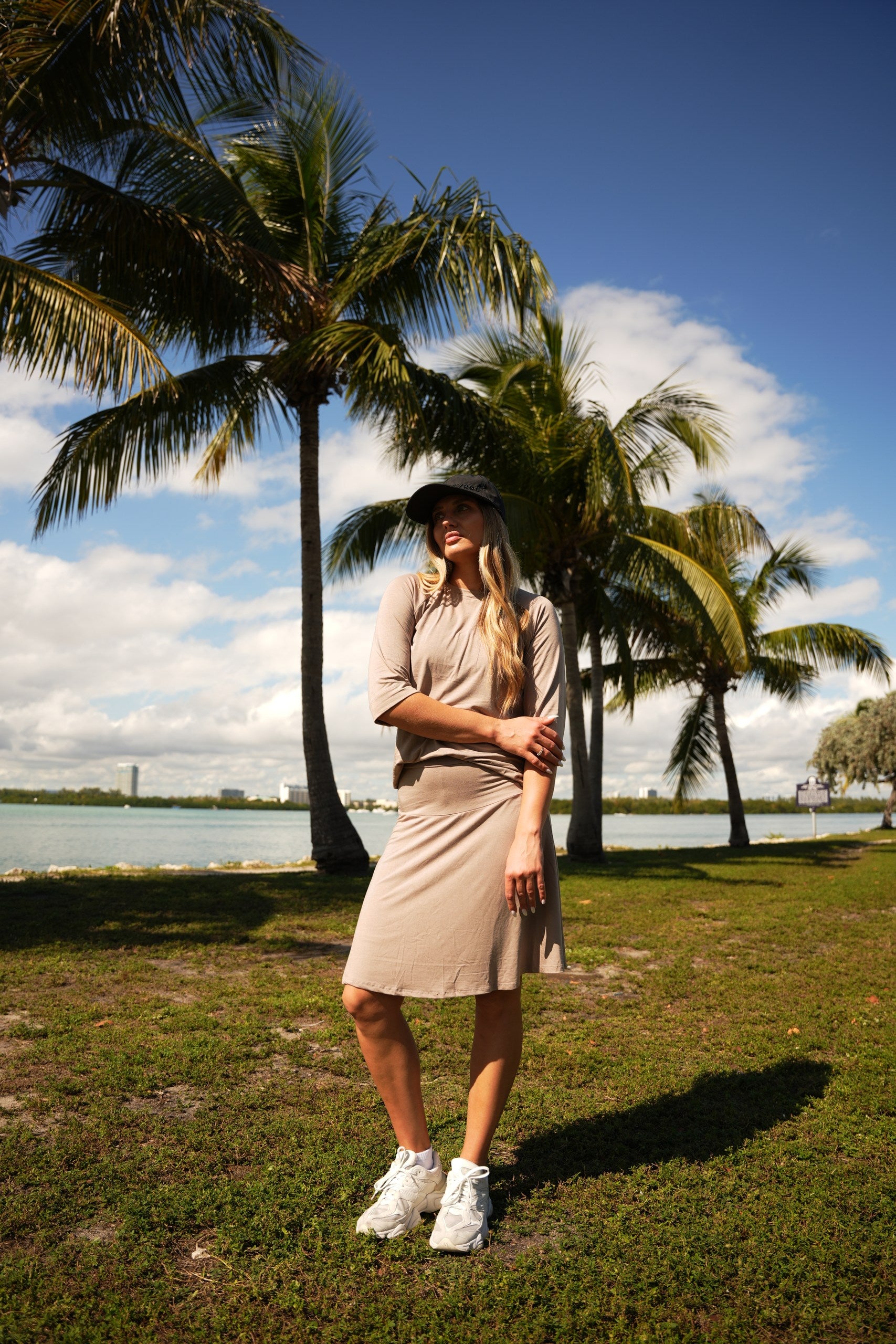 Pair it with any CVRGE skirt for an easy, polished look that carries you from coffee runs to travel days to dinner out. Not a swim shirt — just your new favorite classic.