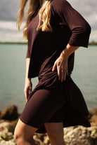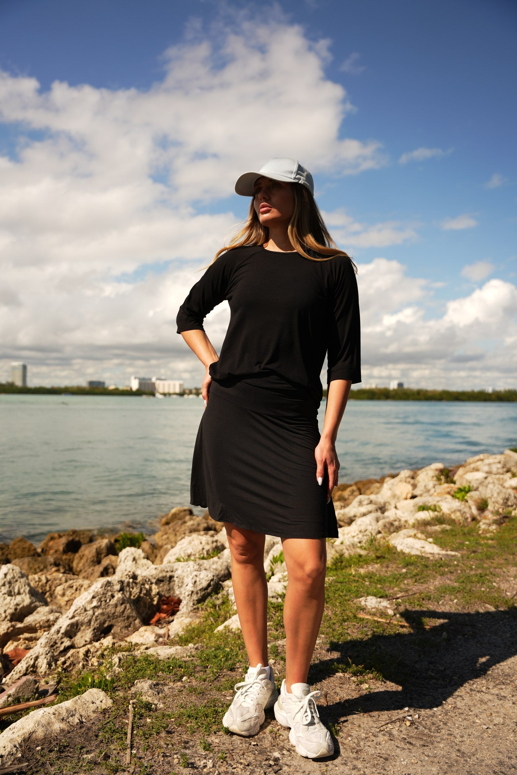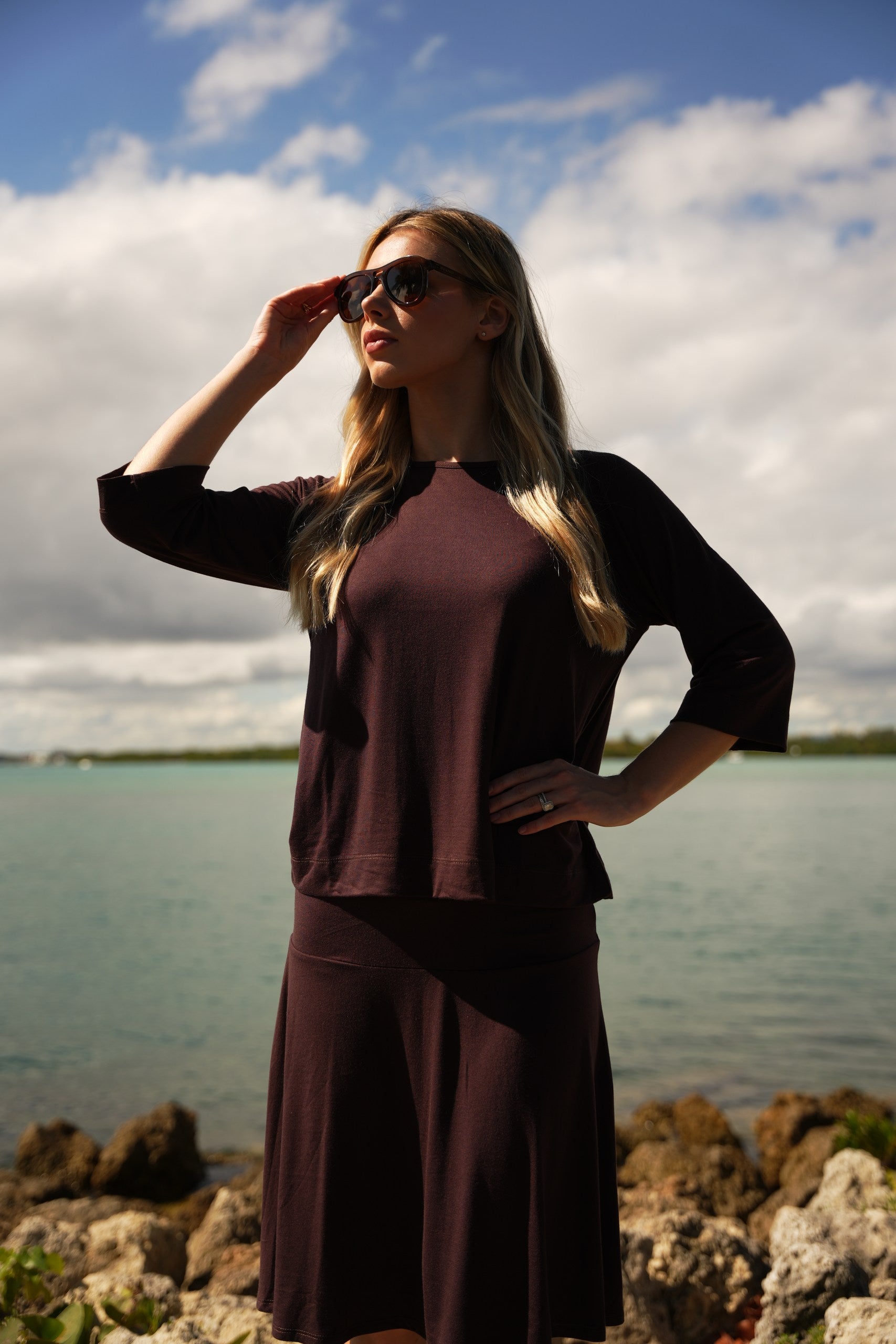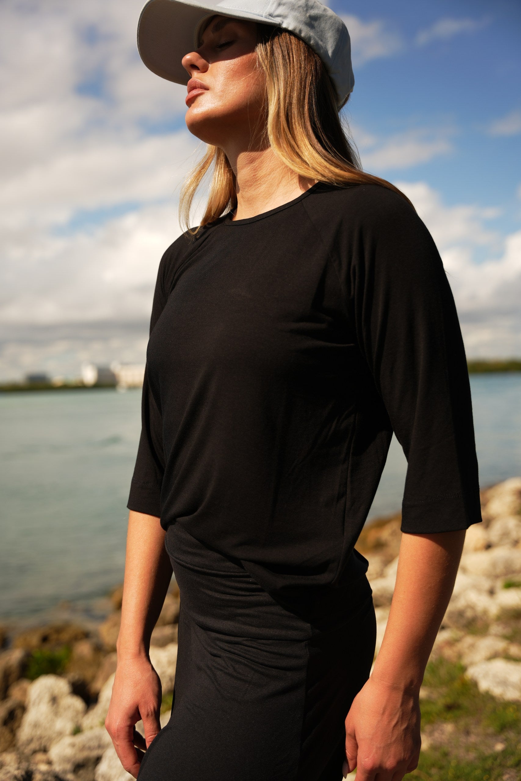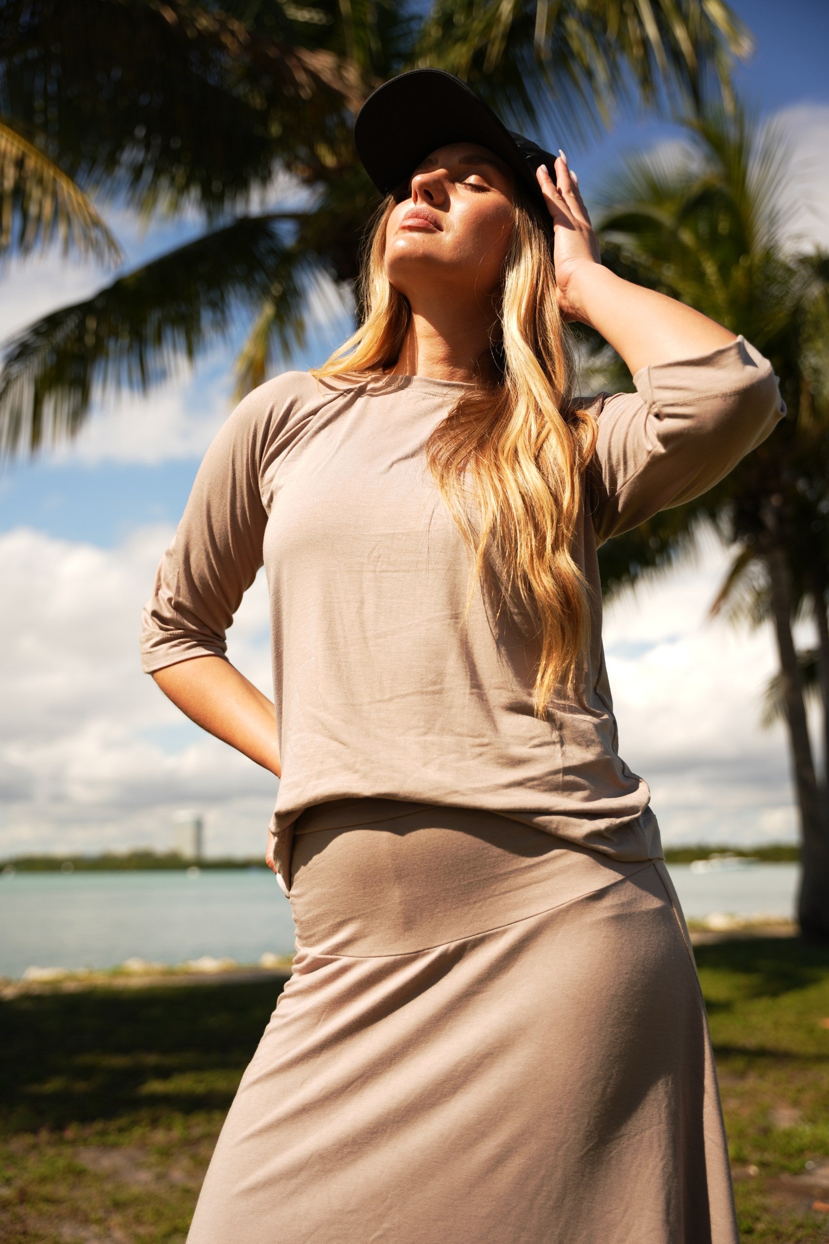 Crafted from our premium brushed super rayon spandex, it’s buttery soft, breathable, and completely opaque — so you can skip the layers. The relaxed, slightly boxy fit drapes beautifully, while the sleeves fall just past the elbow for that perfectly modern, modest silhouette.