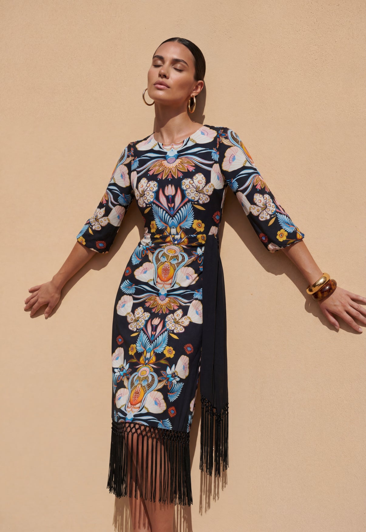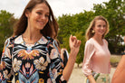 The fit is smooth and streamlined with seamless leg openings and a snap bottom closure for comfort and ease. Offered in Brazil-inspired prints alongside refined solid colorways, select solids are finished with hand-stitched blanket stitch detailing along the neckline, adding an artisanal, resort-level touch.