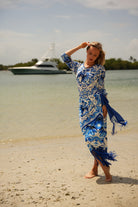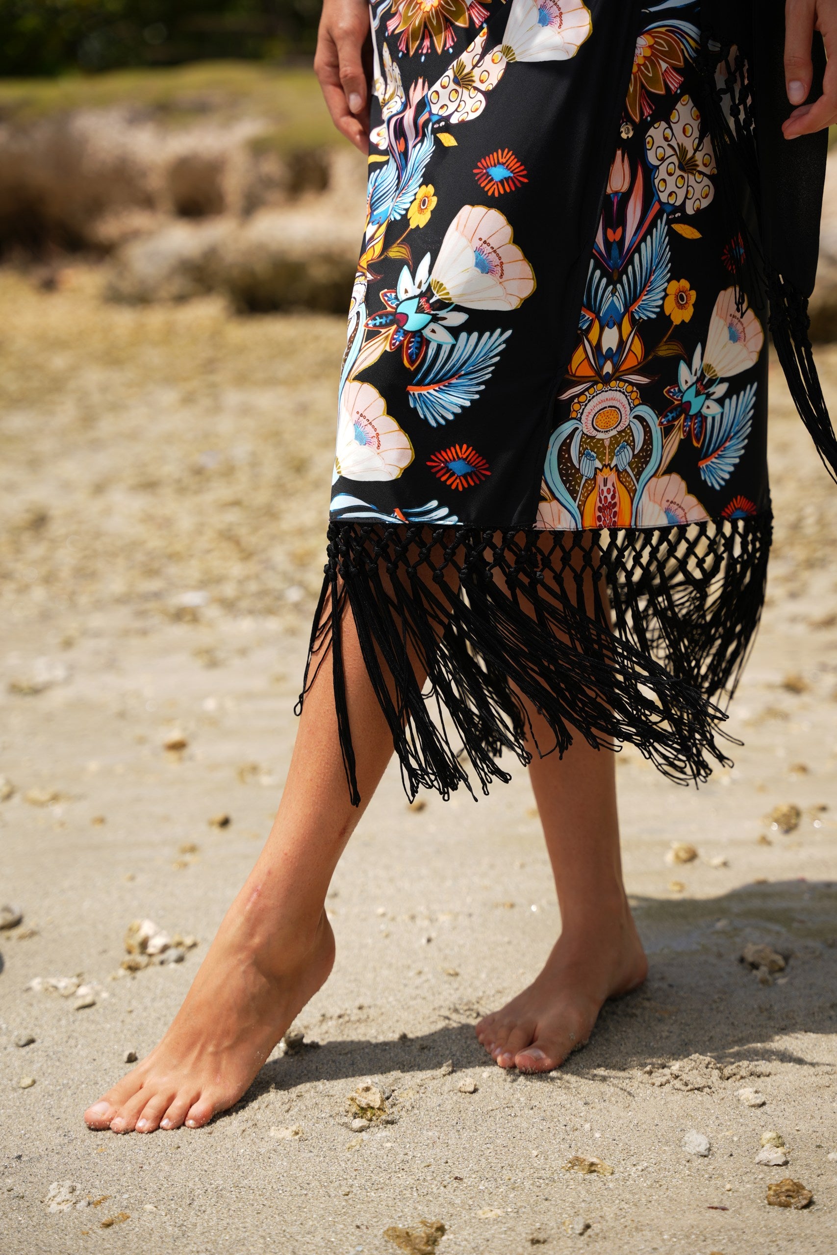 This midi-length wrap skirt ties effortlessly at the waist, letting you adjust the fit just the way you like. Finished with hand-detailed macramé fringe along the hem and belt, it brings texture, movement, and a touch of playful drama—every step feels a little more vacation-coded.