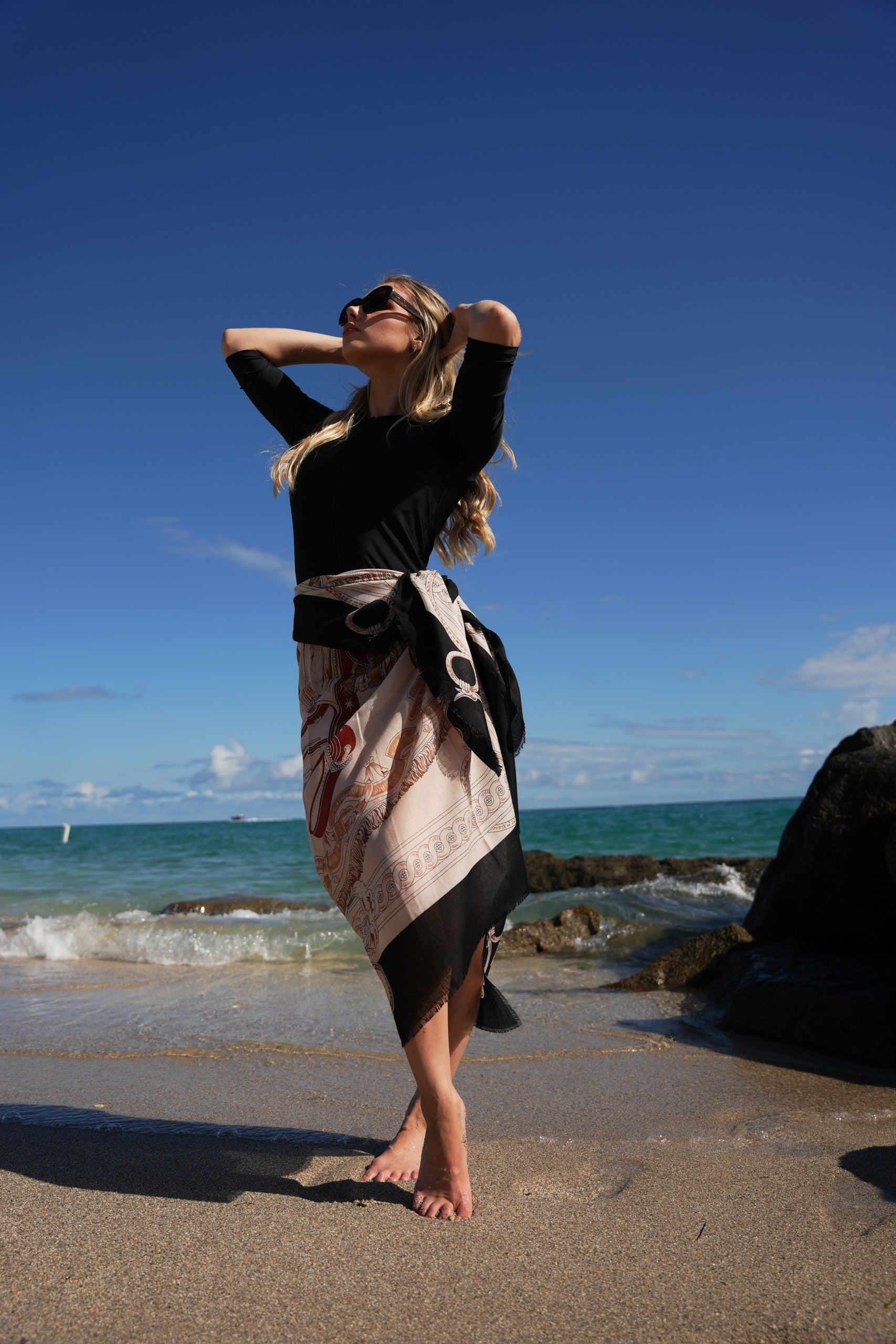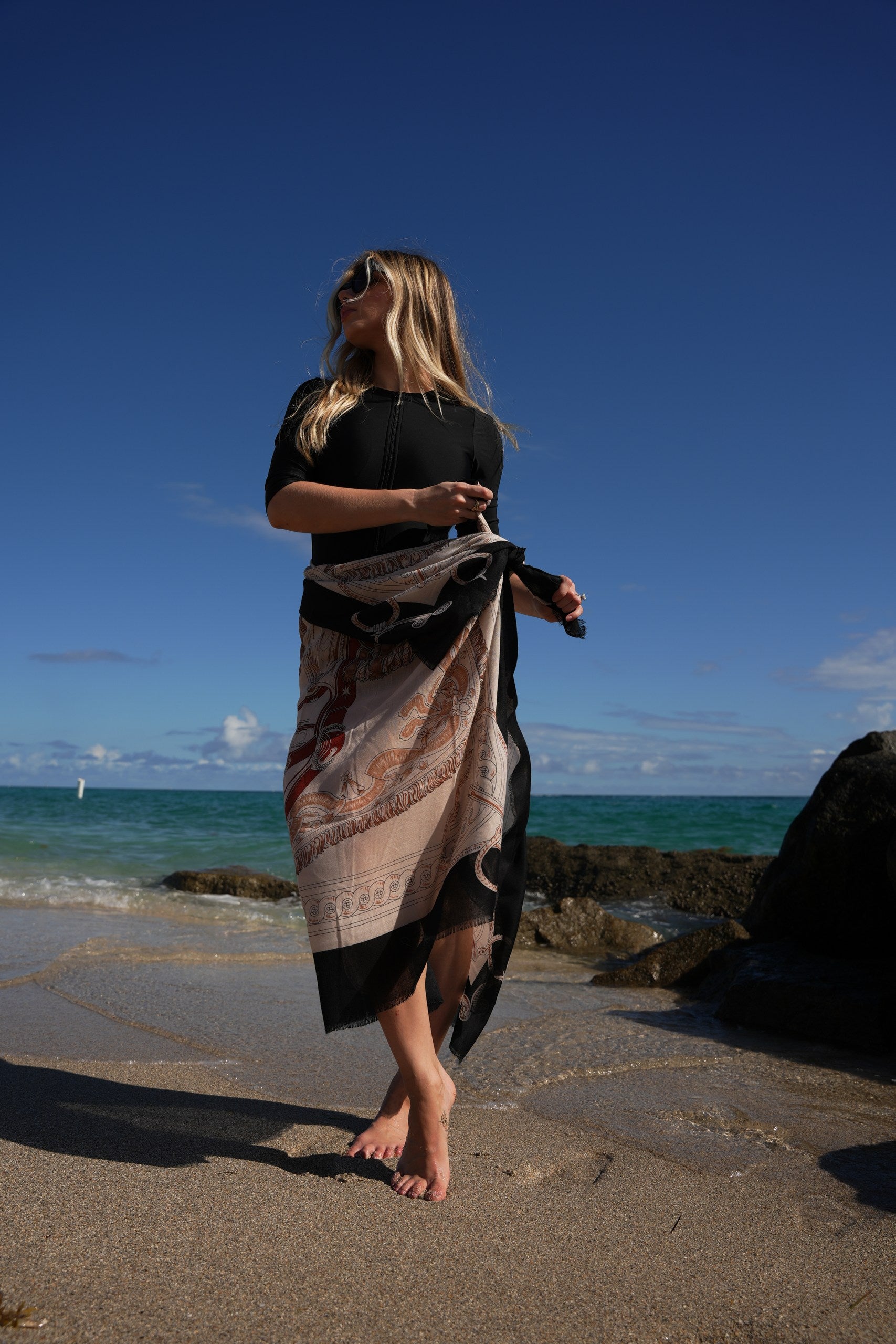 The Sarong is an oversized square cover-up designed for relaxed luxury. Crafted from an ultra-soft, pashmina-feel fabric with a smooth, supple drape, this piece is meant for lounging—not swimming. Think sunbeds, resort mornings, and those in-between moments when you want coverage without commitment.