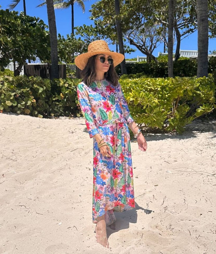 Meet your new vacation MVP: the Hannah Hi/Low Dress. Easy, breezy, and made to move with you from beach mornings to golden hour hangs. The zip-up jewel neckline, flowy waterfall hem, and ¾ sleeves give just enough drama without trying too hard. Wear it cinched or loose—whatever your vibe. Made from quick-dry spandex, so you're never stuck in a soggy suit. Just throw it on and go.