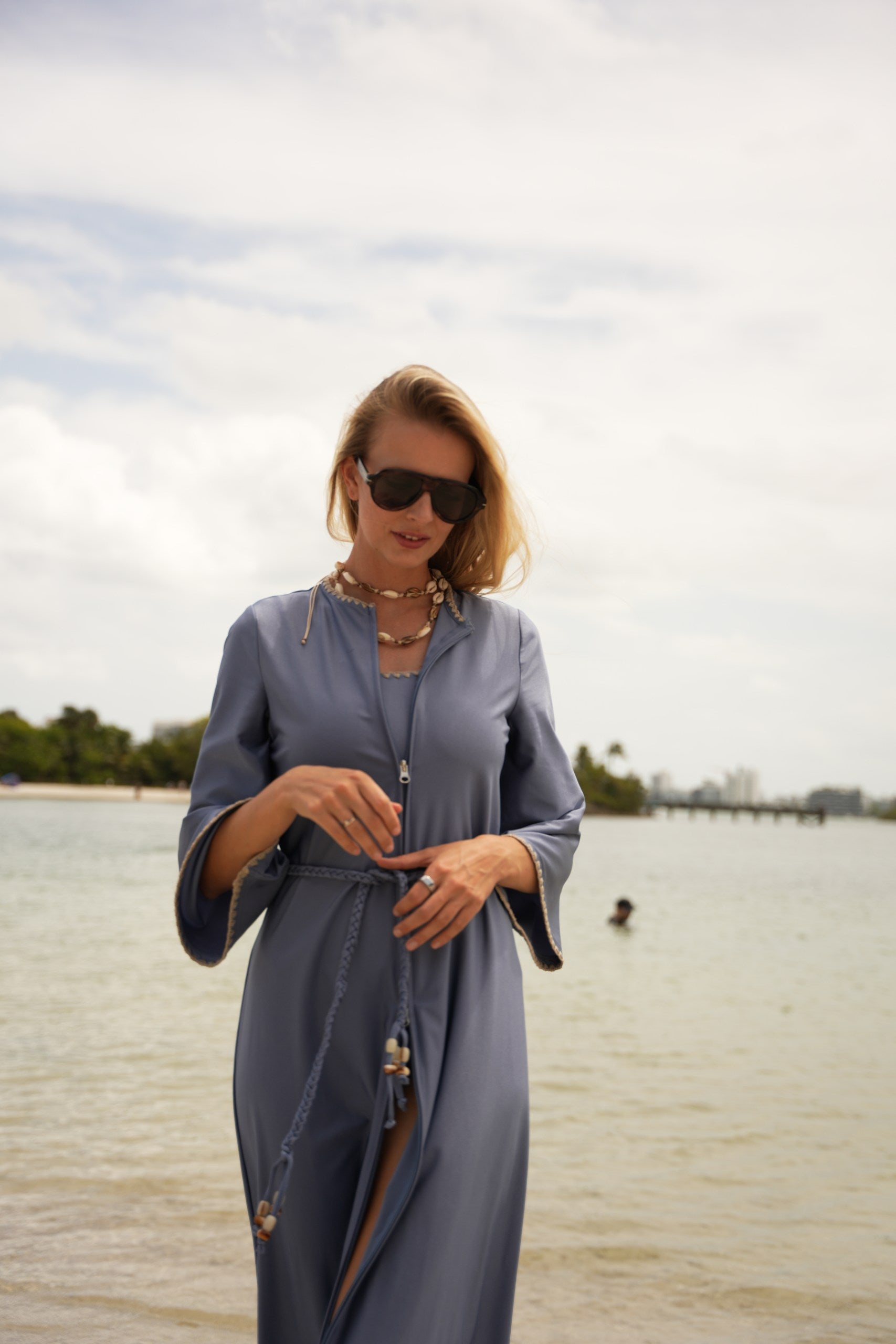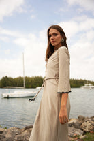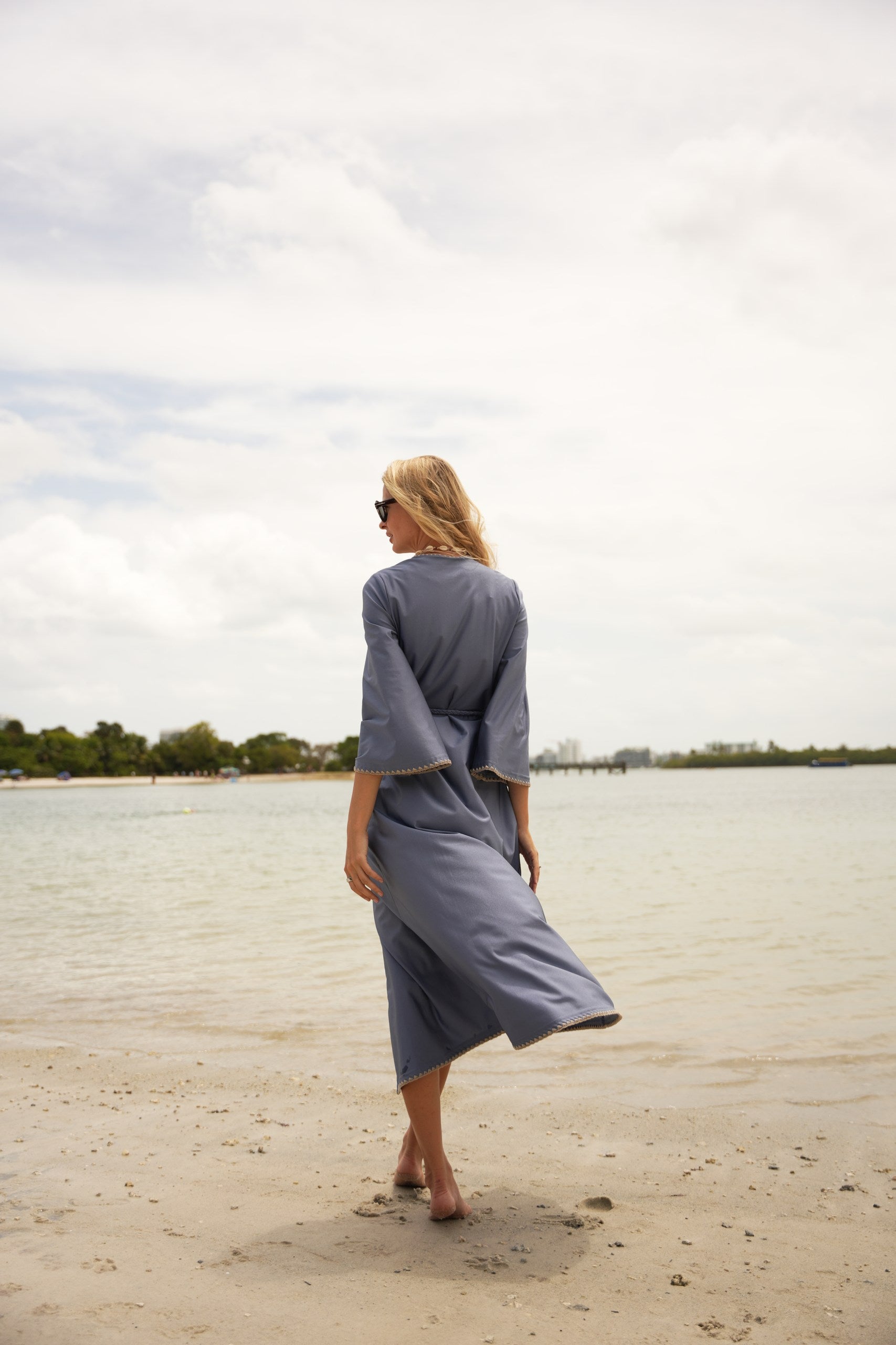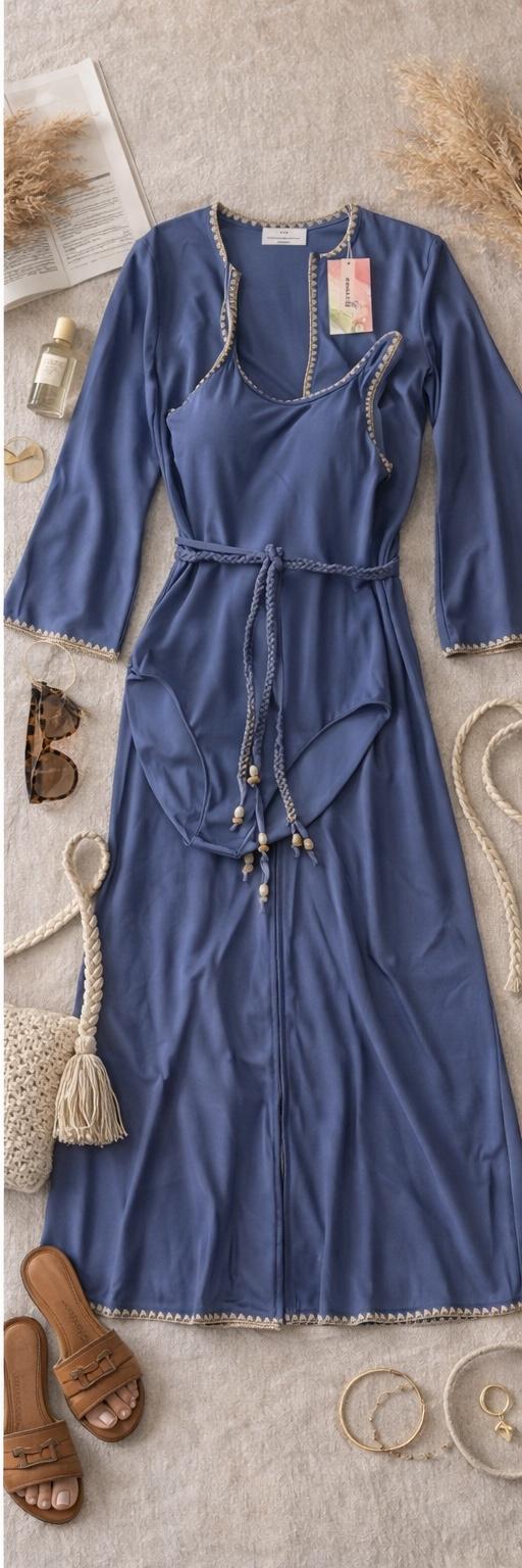 The caftan has that effortless, bohemian Mallorca energy — blanket-stitched edging along the neckline and sleeves, a relaxed drape, and just enough detail to feel intentional. Choose between azure blue with cream stitching or sand beige with black stitching, finished with a beaded belt detail that softly defines the waist but still feels easy.