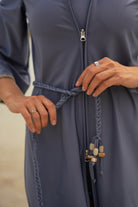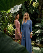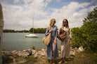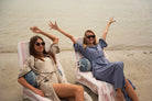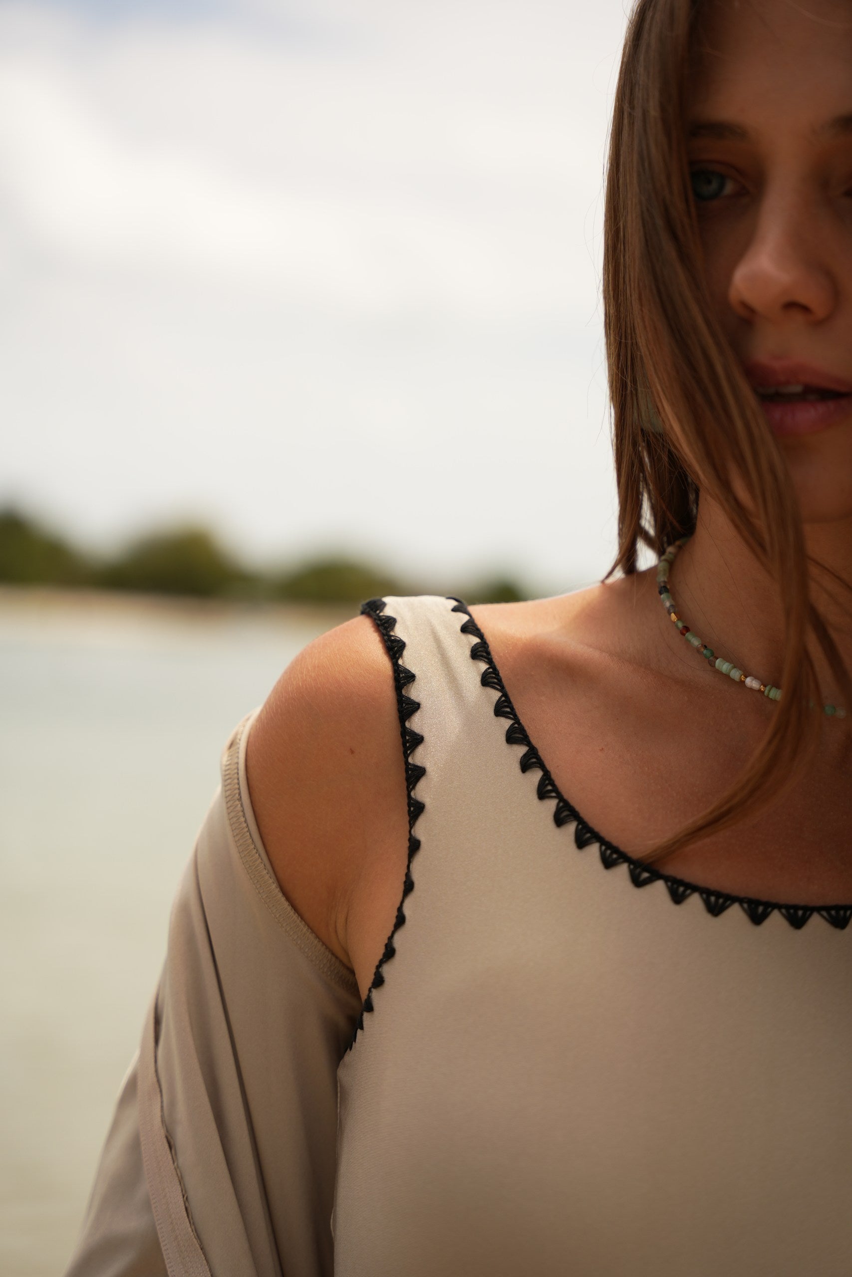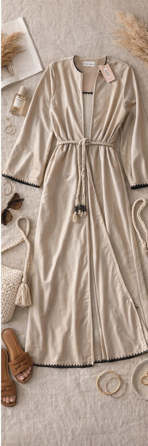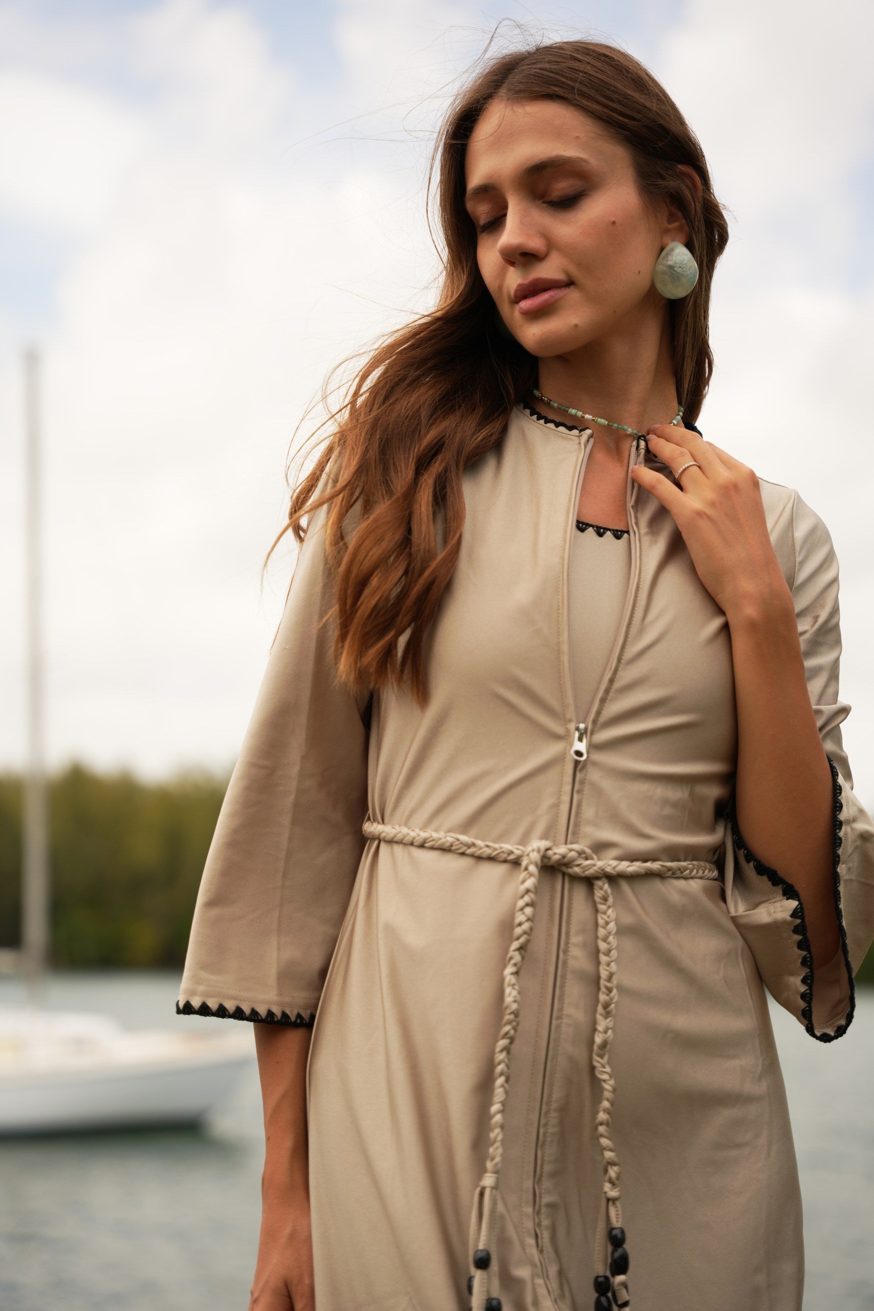 The caftan has that effortless, bohemian Mallorca energy — blanket-stitched edging along the neckline and sleeves, a relaxed drape, and just enough detail to feel intentional. Choose between azure blue with cream stitching or sand beige with black stitching, finished with a beaded belt detail that softly defines the waist but still feels easy.