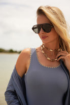 Mallorca is a two-piece modest swimwear set designed for the woman who wants to look pulled together before and after the swim — without outfit changes, without overthinking it. A flowy maxi caftan layered over a supportive one-piece swimsuit, made for pool days that turn into lounging, snacks, and “maybe we’re staying a little longer.”