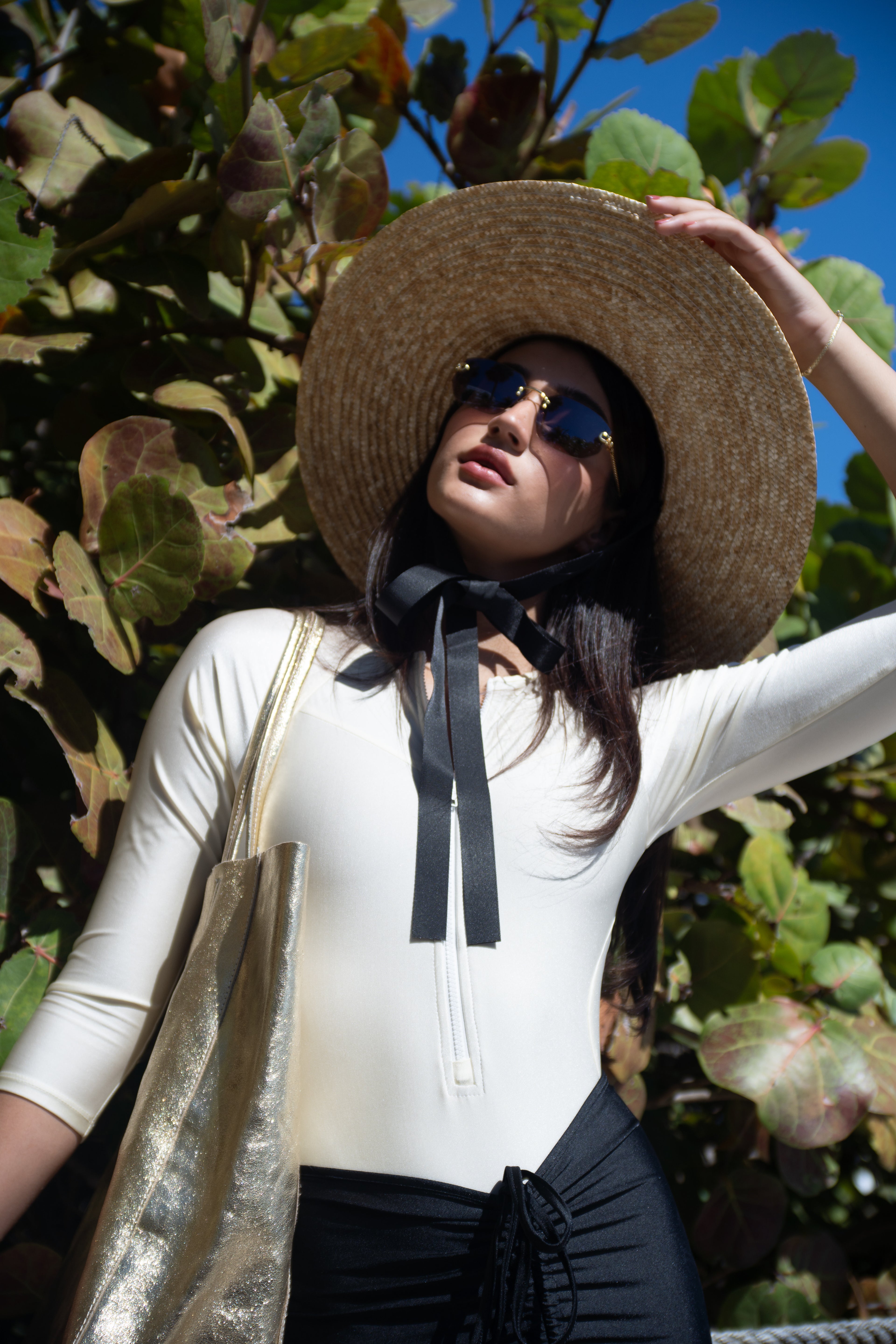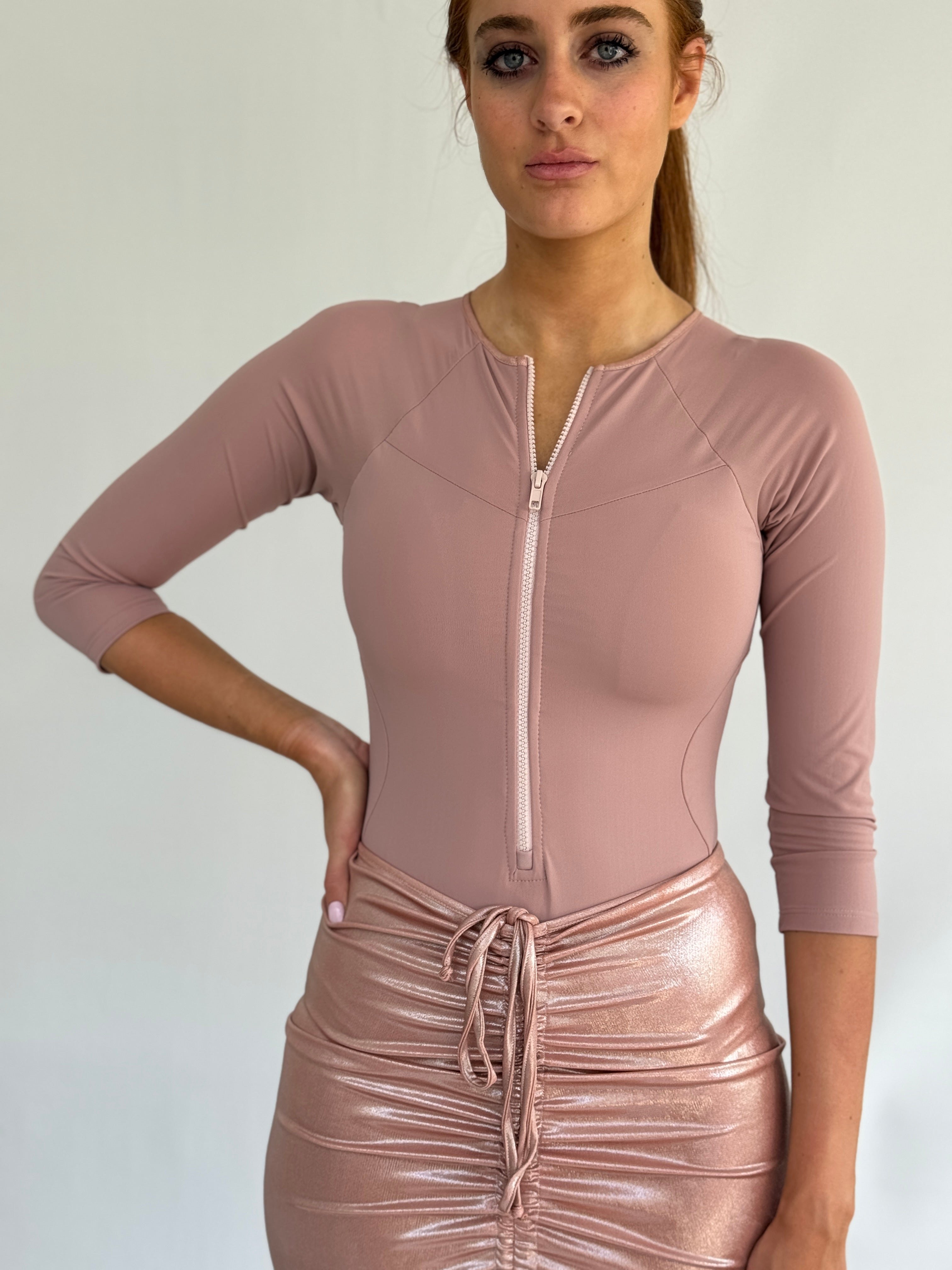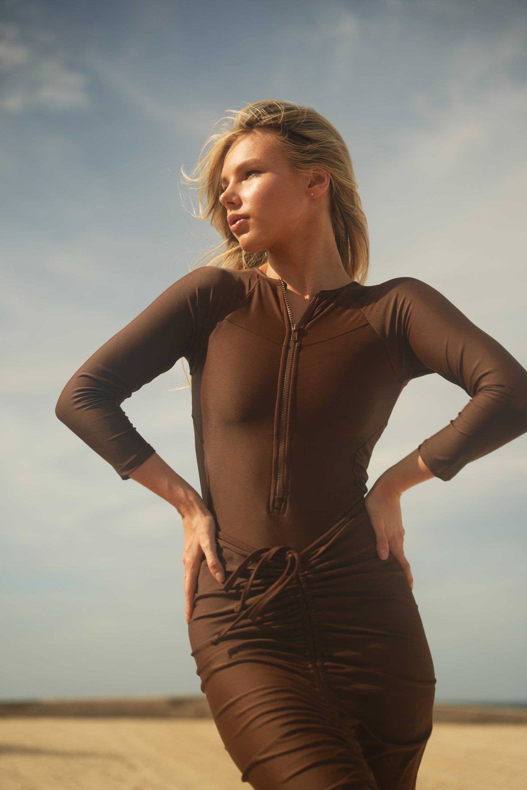 Introducing “Le Body” – the ultimate fusion of shapewear and swimwear! This chic one-piece features compression mesh lining for a body-hugging fit that supports and sculpts. With a jewel neckline that zips down 14”, it transitions effortlessly from pool workouts to sunset cocktails. The bracelet-length sleeves add a sporty yet feminine touch, while the seamless bottom ensures a flawless silhouette. Crafted from quick-dry spandex and UPF fabric, “Le Body” is your stylish go-to for sun season. Elevate your CVRGE wardrobe today!