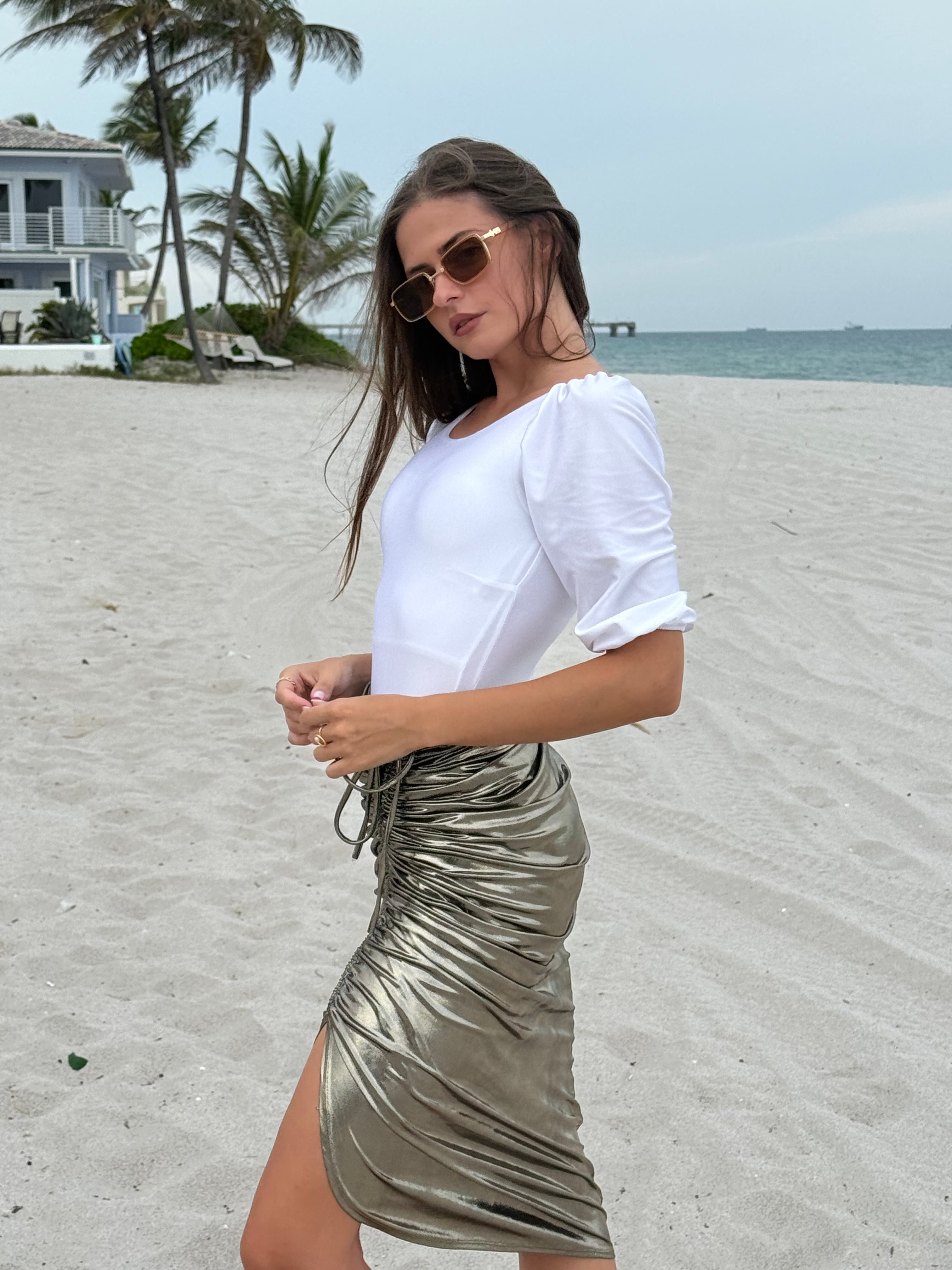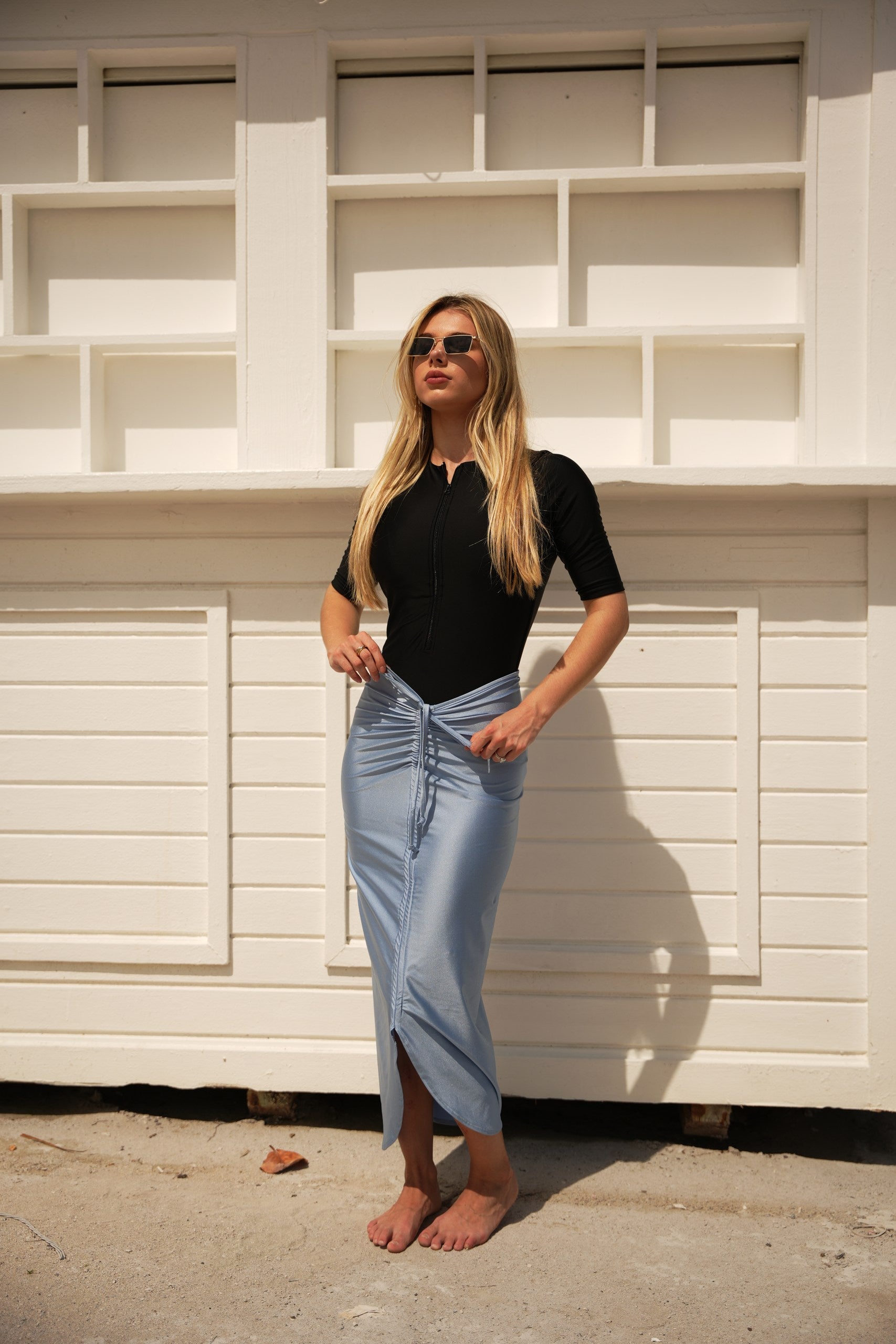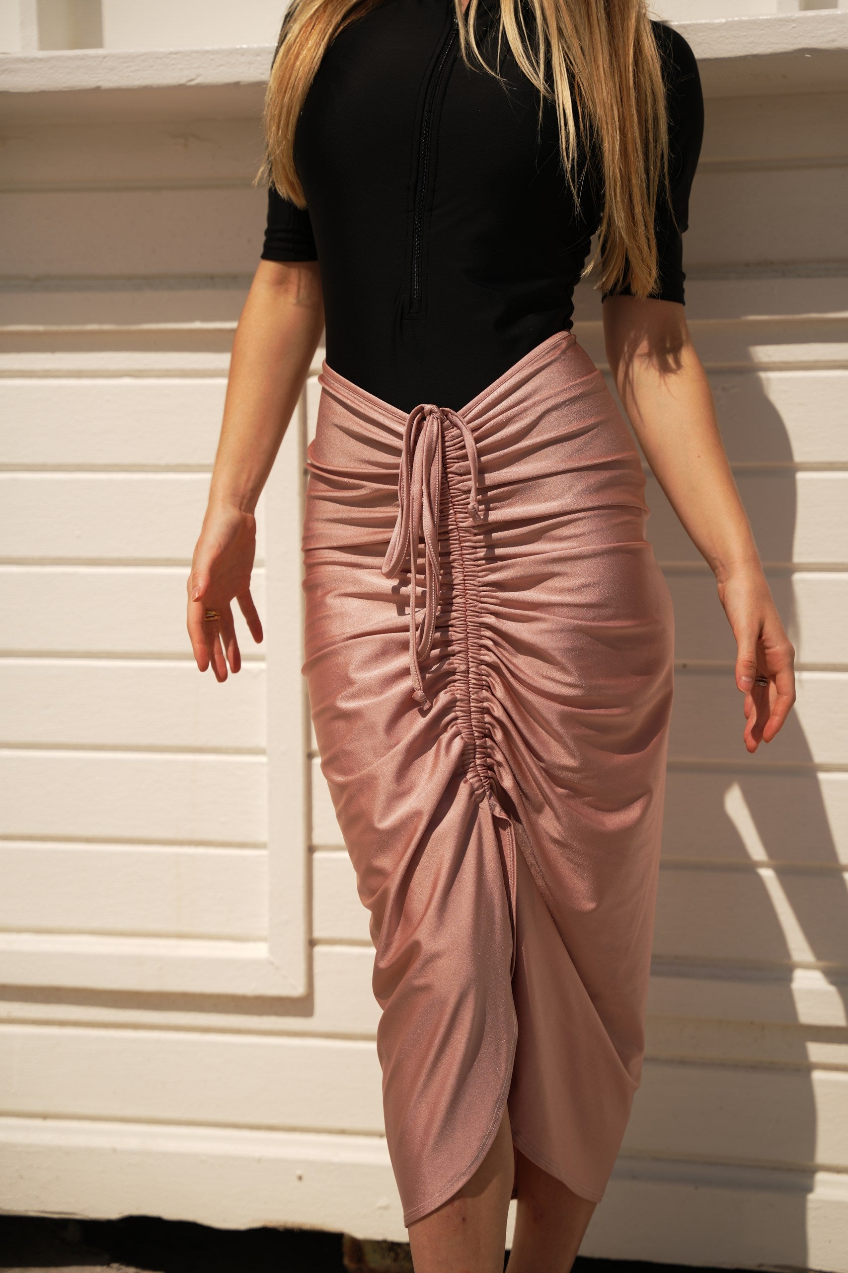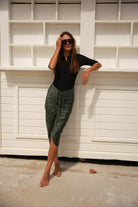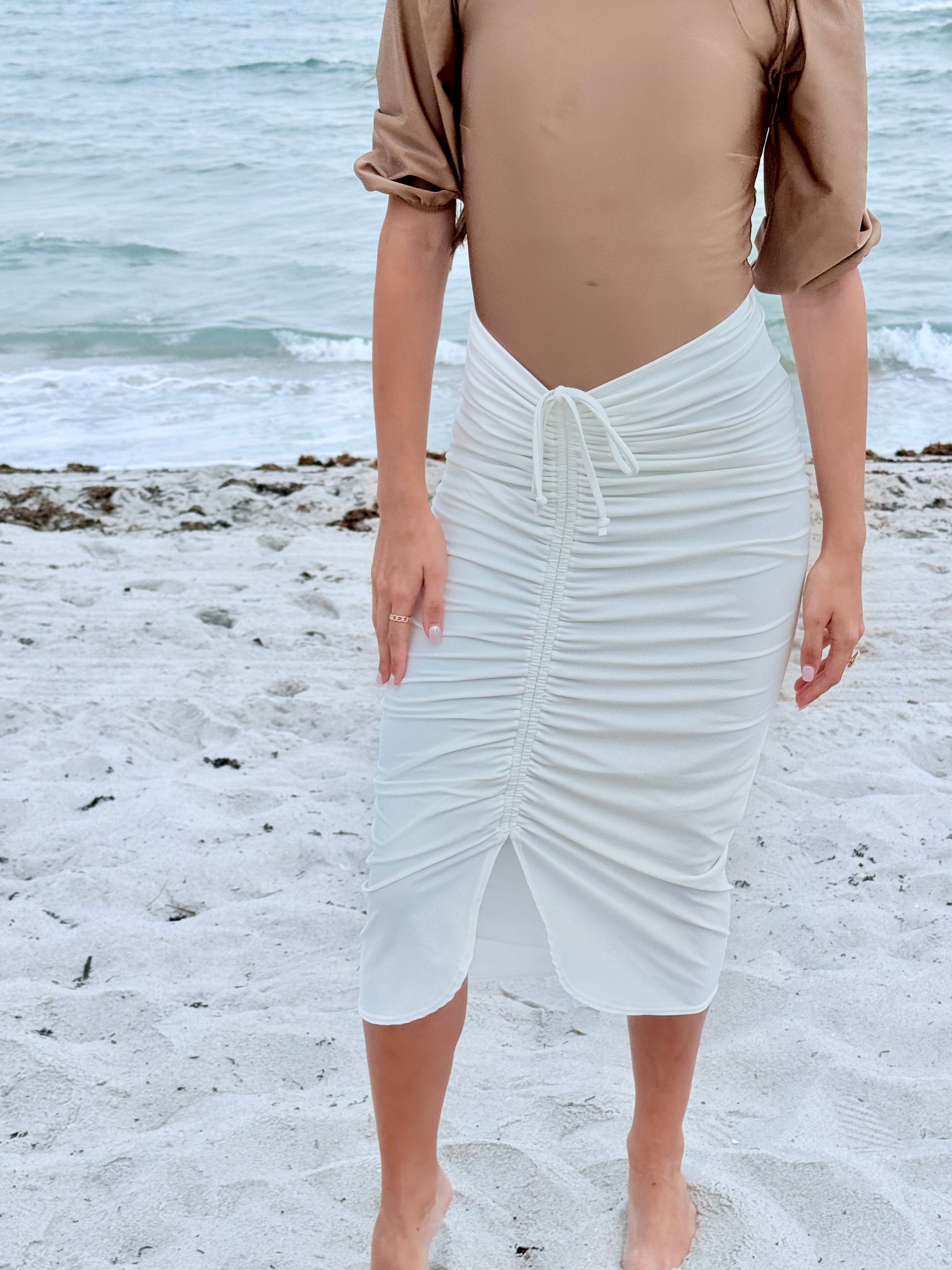 Not your average swim skirt. Mahlia is made to move with you—from the beach to wherever you’re headed next. It’s got an adjustable ruched drawstring you can wear down the center or off to the side, depending on your mood.
